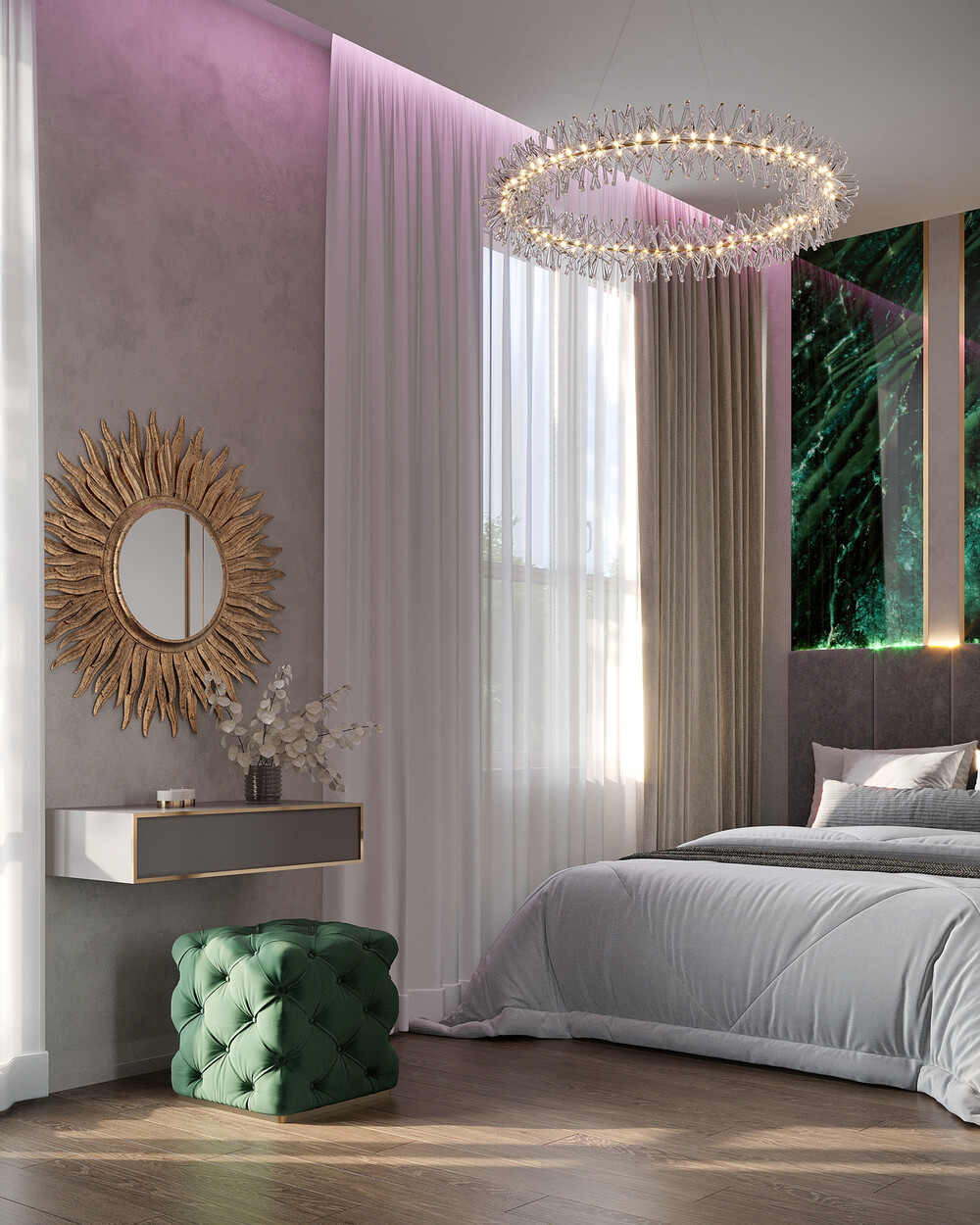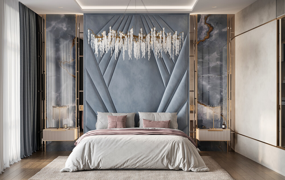 Пространство спальни полностью изолировано и спроектировано для качественного отдыха. Мягкое изголовье кровати во всю ширину стены дополнили зеркалами. Потолок украшает светильник в форме ветвей, который выполняет роль арт-объекта.