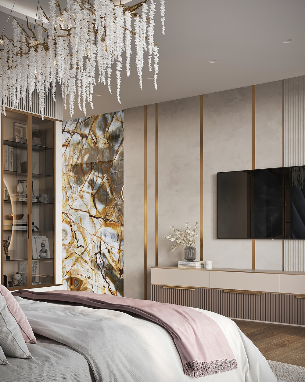 Напротив спального места стена оформлена крупноформатным панно из оникса в золотисто-коричневых тонах, которое стало визуальным акцентом зоны. Вместо стандартного освещения мы внедрили несколько световых уровней, включая бра и настольные лампы у кровати.