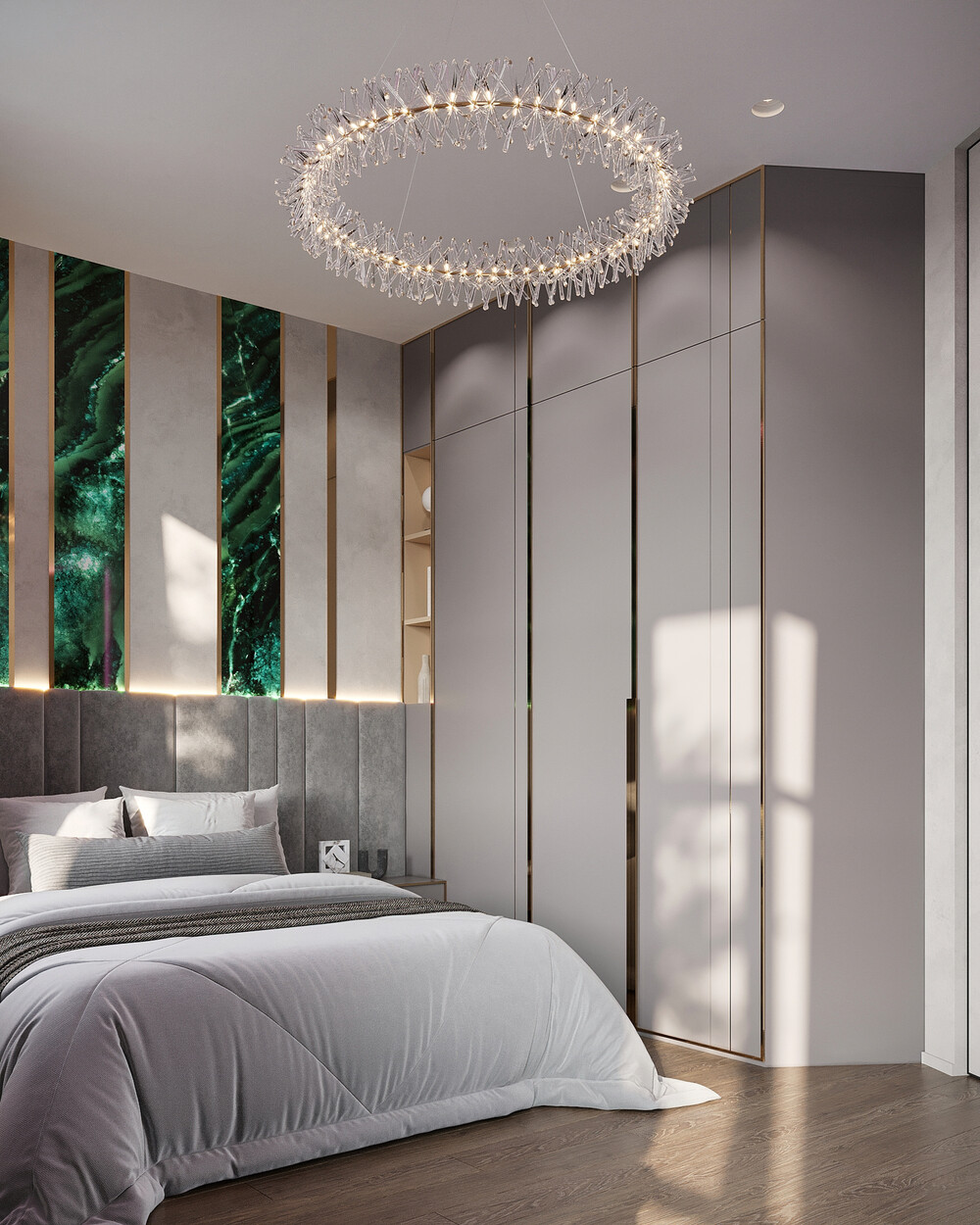 Кровать дополнили мягким изголовьем, а хранение вещей организовали во встроенных шкафах. В отделке применили спокойную гамму с добавлением активных зеленых акцентов.