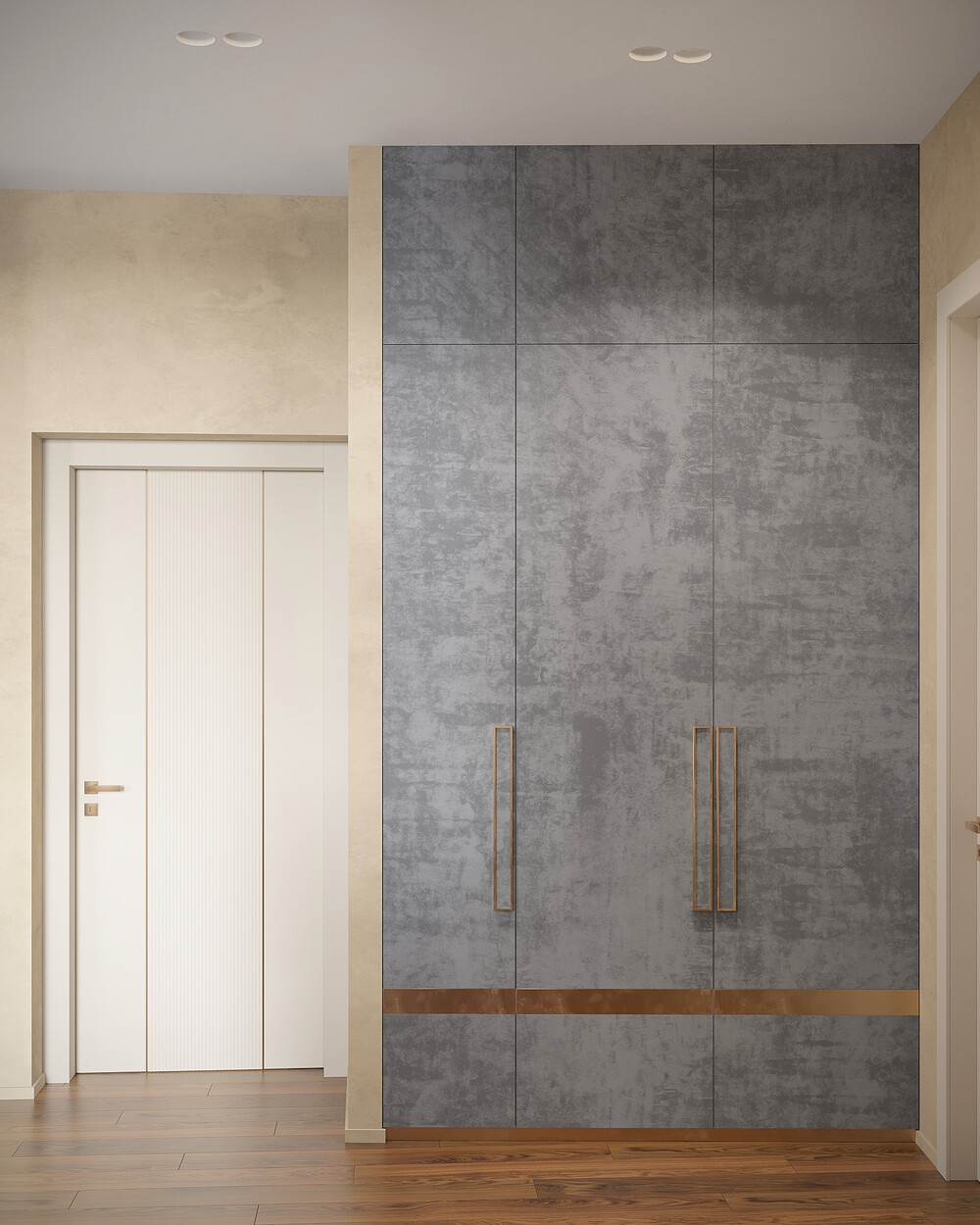 Оформление входной группы подчеркивает общий масштаб и высоту помещений в квартире. Высокие дверные полотна визуально поднимают уровень потолка и вытягивают пространство вверх.
