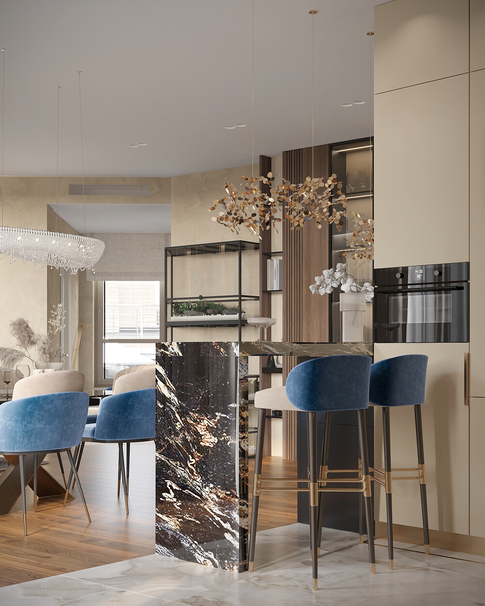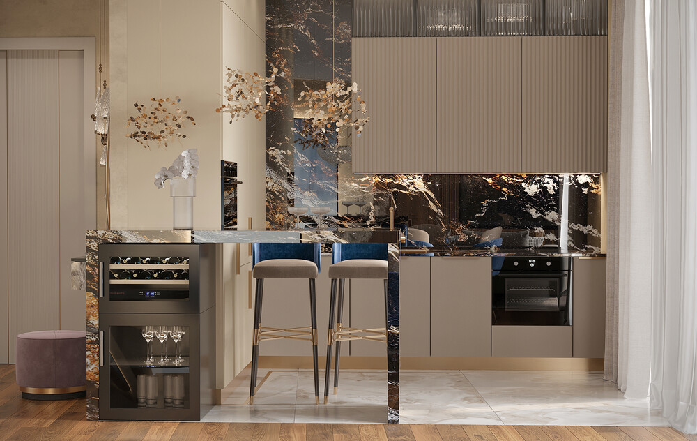 Кухонную зону сделали визуально легкой за счет светлых фасадов и отделки камнем. Каменные панели со стен переходят в широкую барную стойку, которая служит главным акцентом в этой части квартиры. Такое решение встречает гостей прямо с порога и задает тон всему интерьеру.