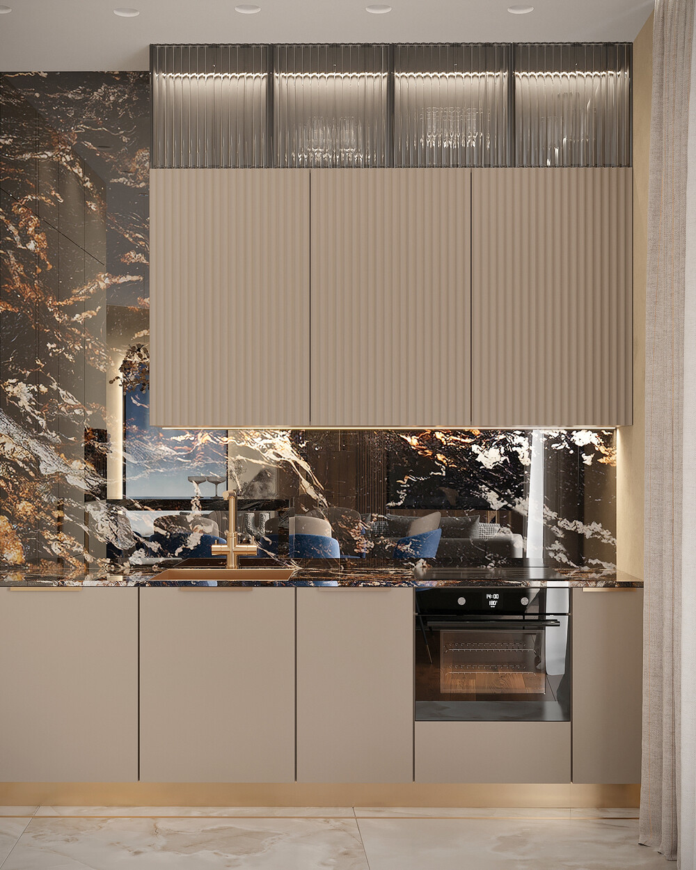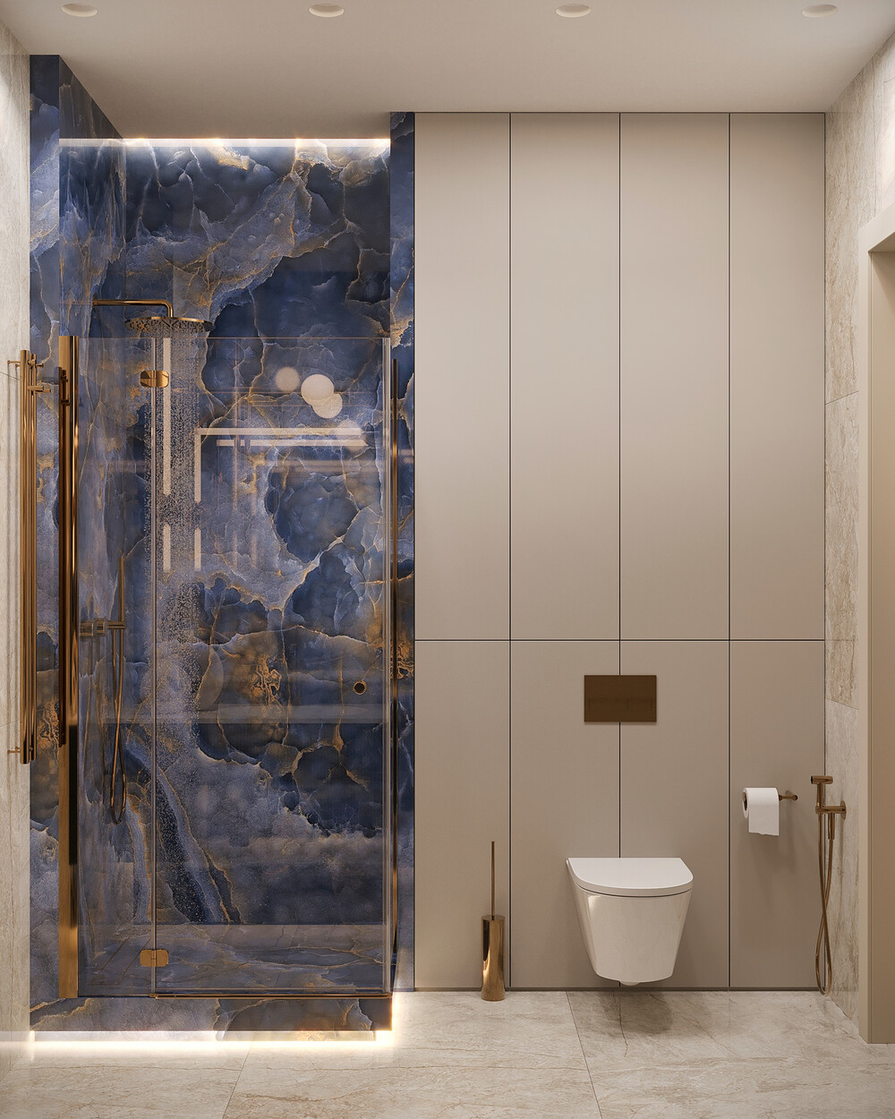 Керамогранит под мрамор с золотистыми прожилками — использовали на полу и для отделки стен, создавая эффект бесшовного пространства.