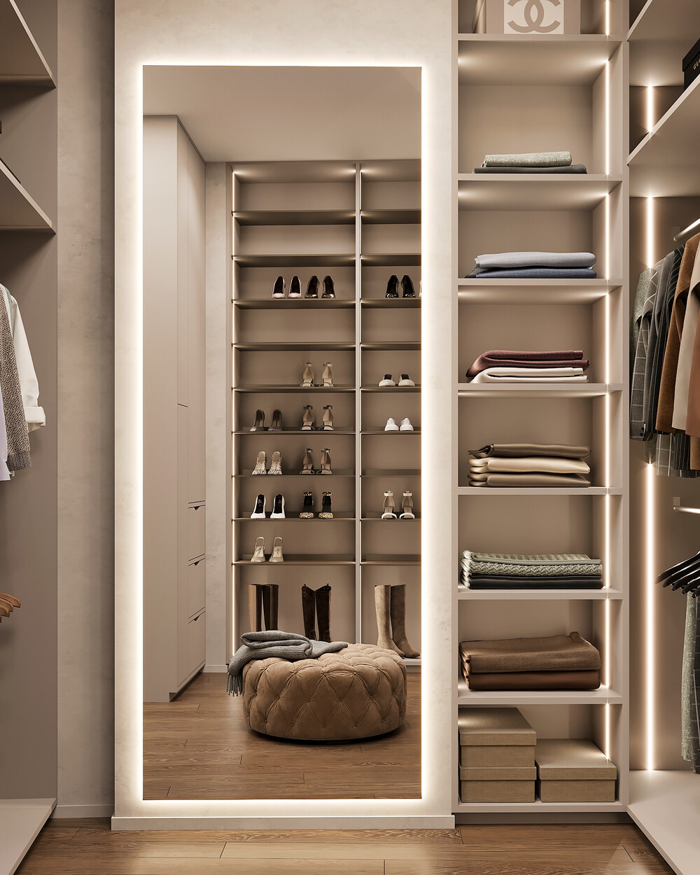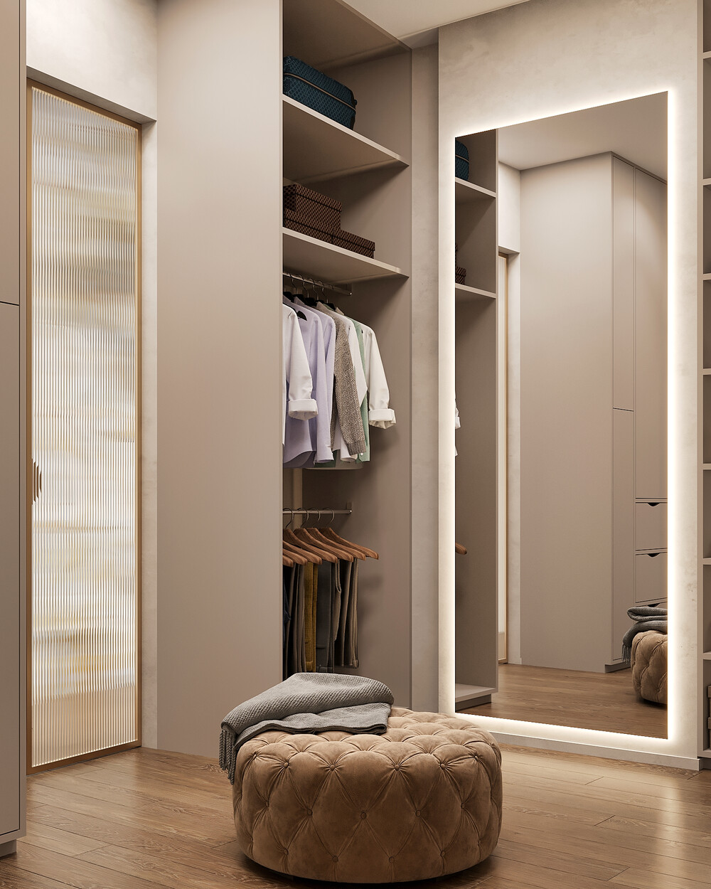 Мы сделали эту зону максимально функциональной и скрытой от посторонних глаз. Внутри установлены шкафы со встроенной подсветкой, открытые стеллажи и специальные секции для хранения. Фасады и стены в гардеробной отделаны алькантарой, что добавляет мягкости и премиальности отделке. Скрытые двери сливаются со стенами, поддерживая идею чистого пространства без швов.