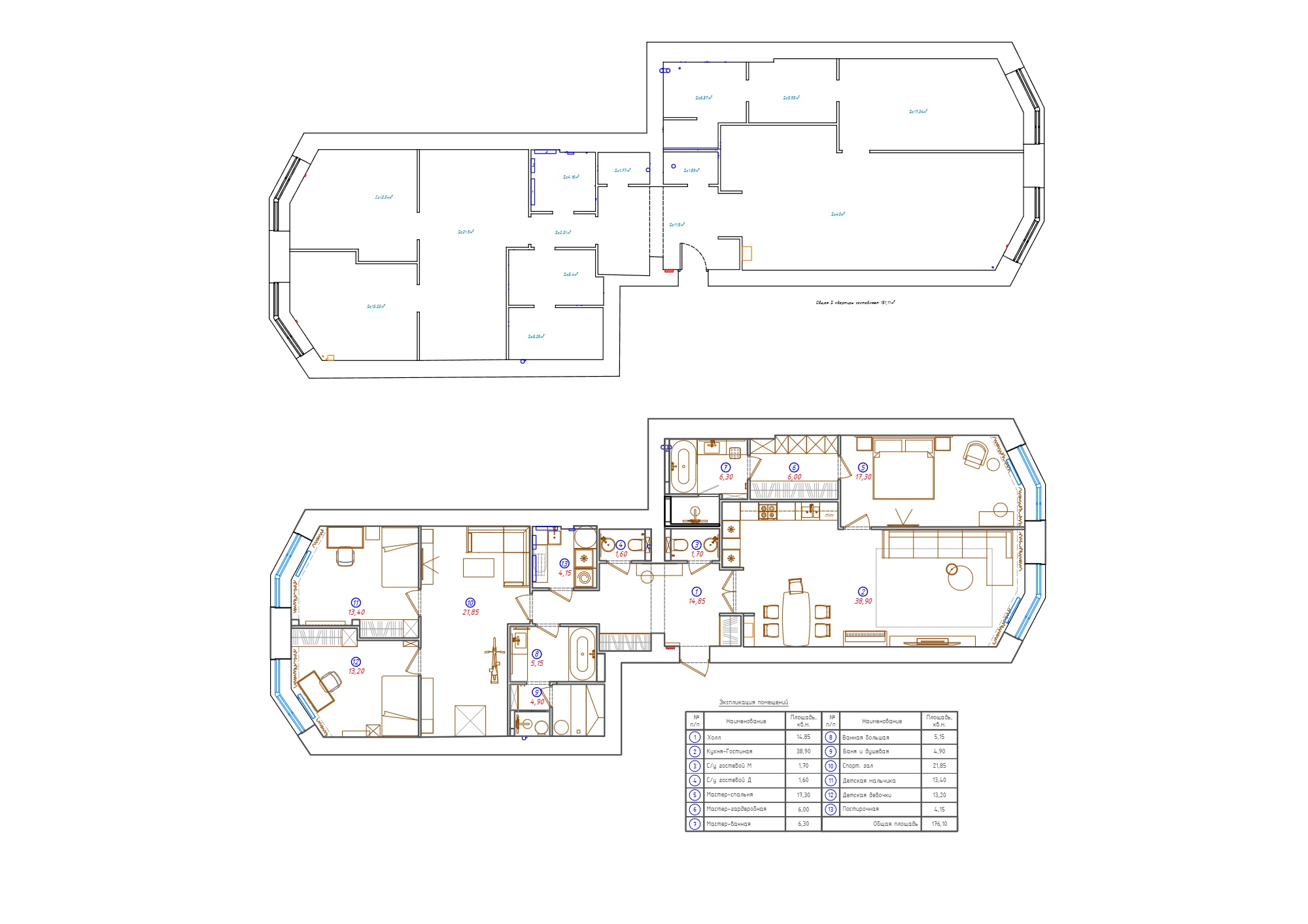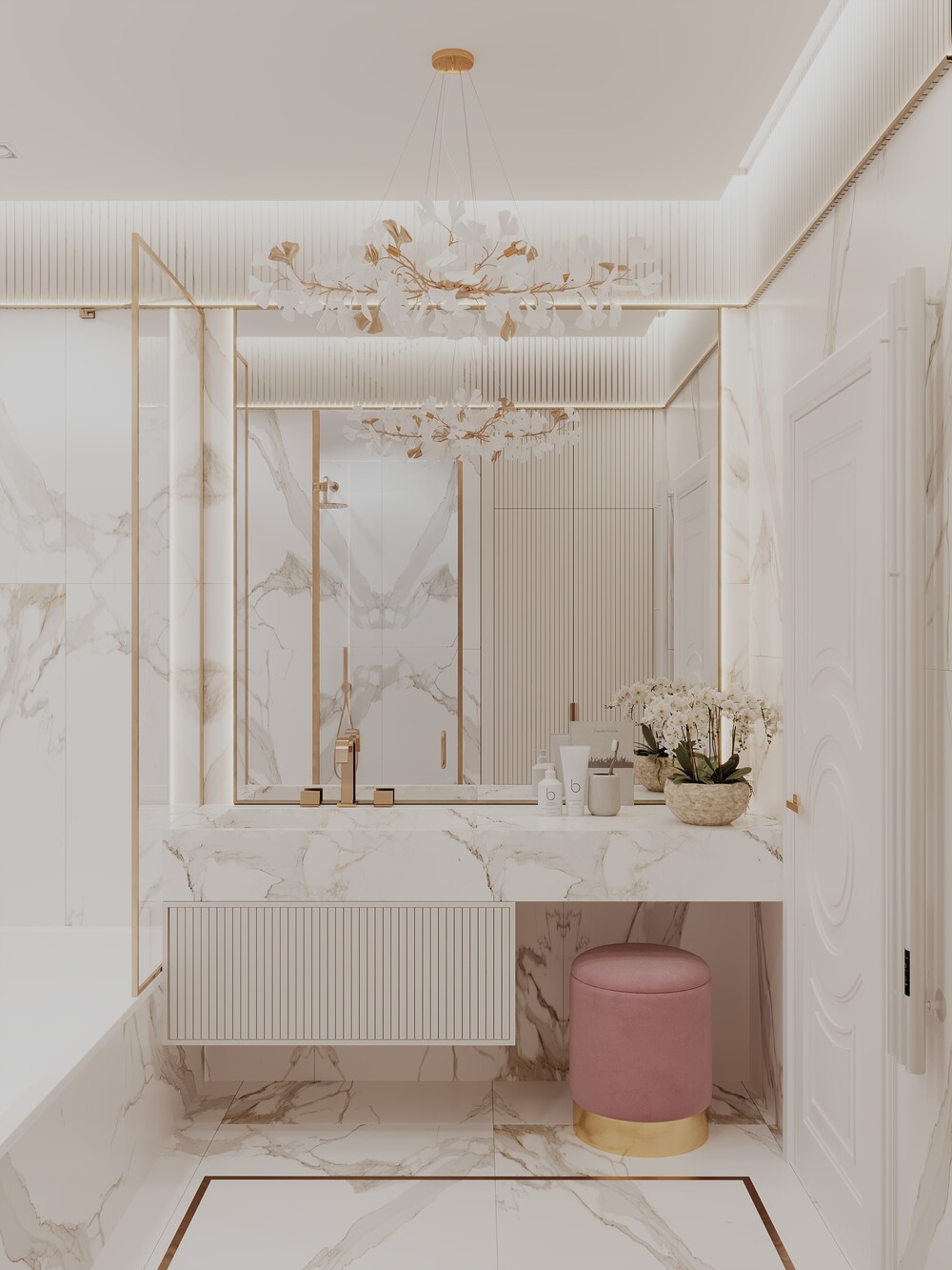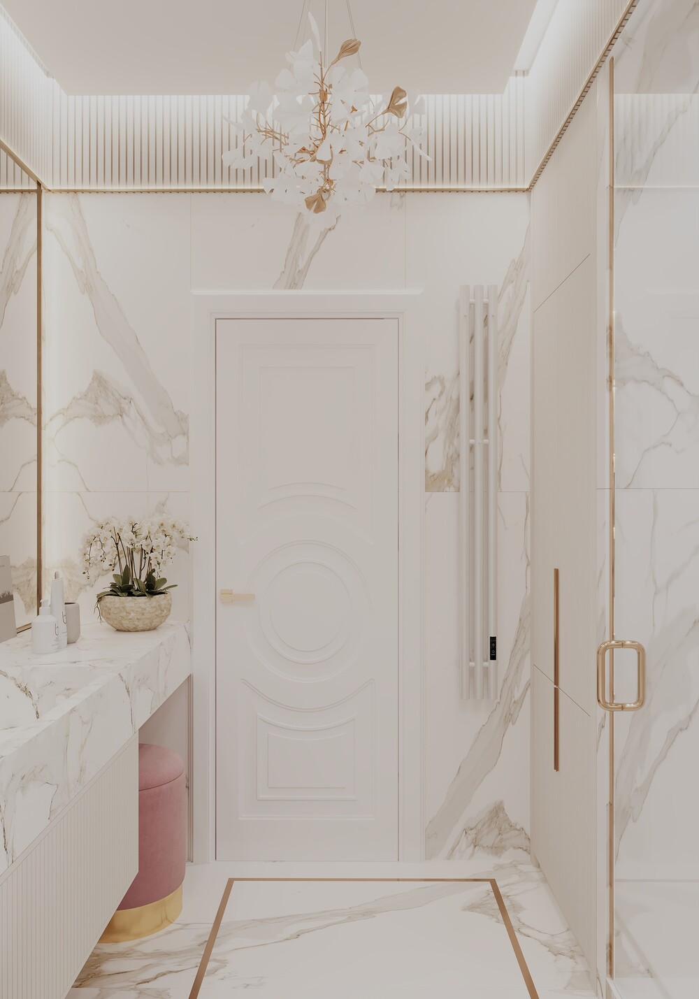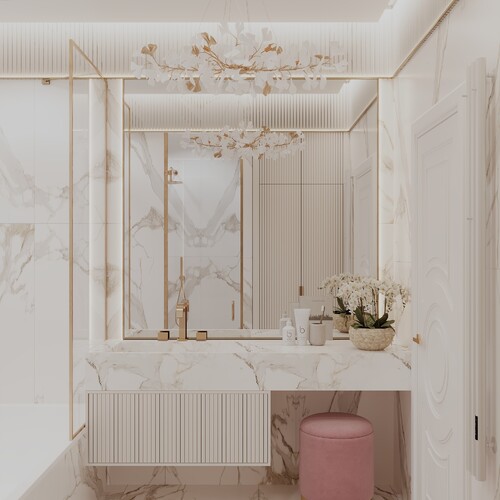 Интерьер выполнен в неоклассическом стиле с современными элементами. Основная палитра — теплая бежевая база с добавлением синих и розовых тонов в детских комнатах. Темные оттенки в гостевом санузле разбавляют общую светлую гамму, добавляя пространству глубины. Латунные детали и подсветка связывают все помещения в единую стилистическую историю.
