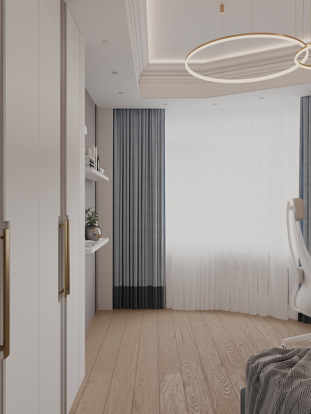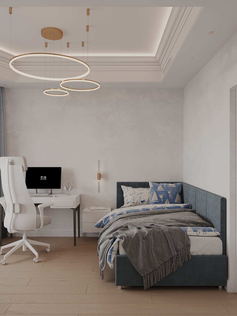 Базовый светлый фон здесь разбавили глубокими синими акцентами в текстиле и обивке мебели. Кровать с мягким изголовьем стоит у стены, а рабочее место мы вынесли к окну для лучшего освещения.