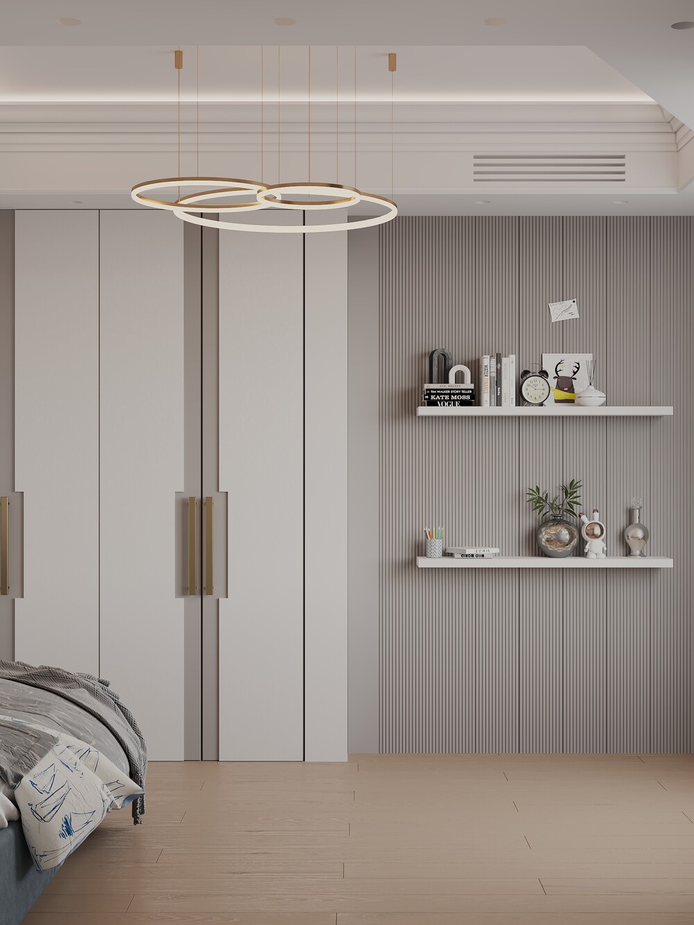 Шкафы встроили в ниши и дополнили латунной фурнитурой в тон остальным элементам квартиры. Для книг и личных вещей предусмотрели открытые полки с локальной подсветкой.