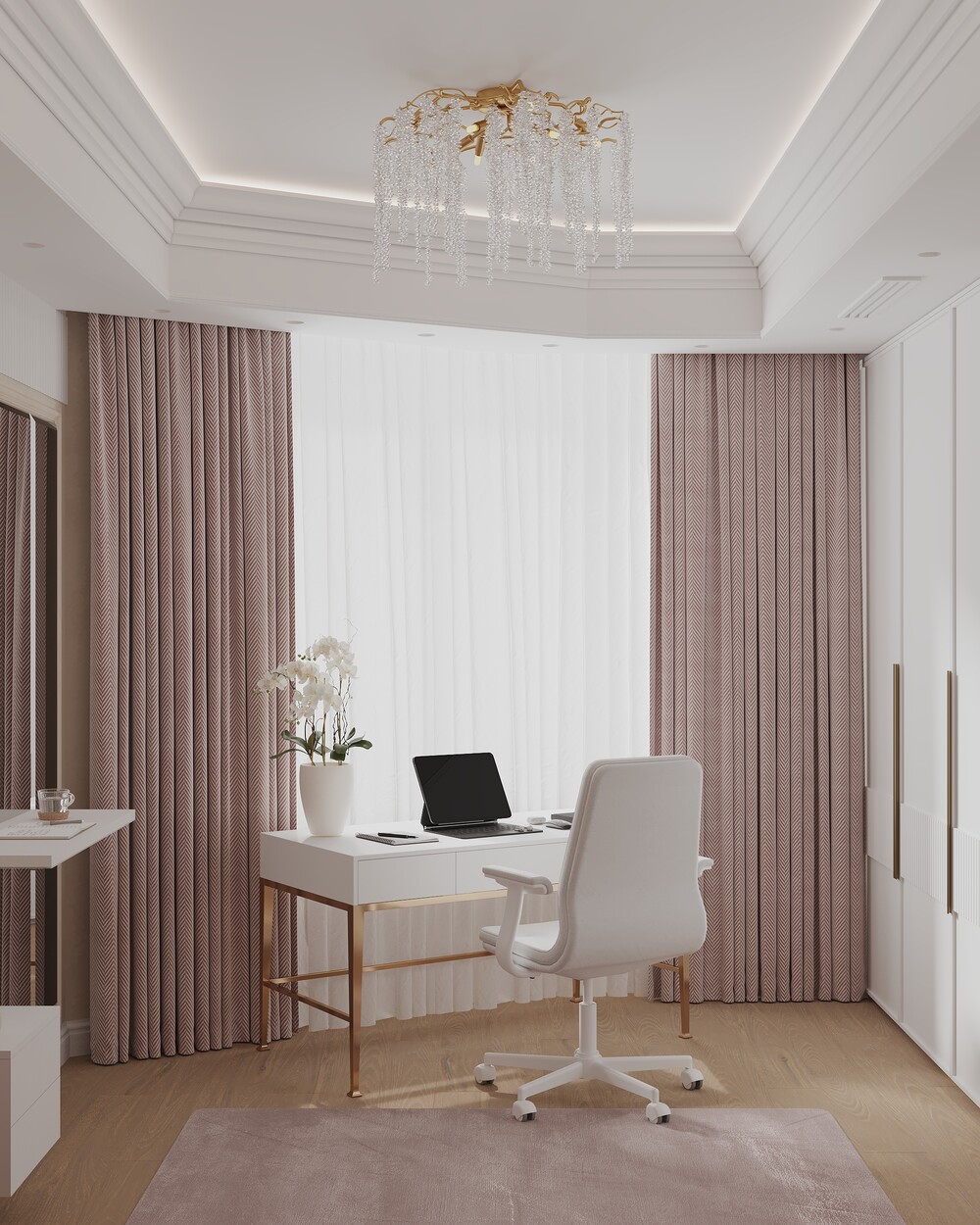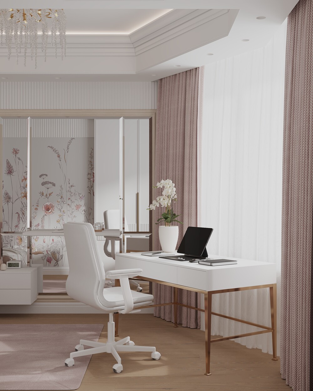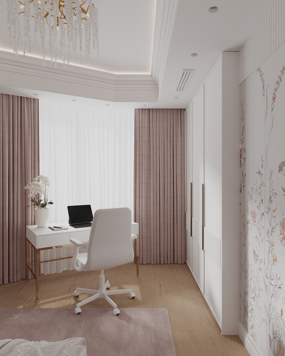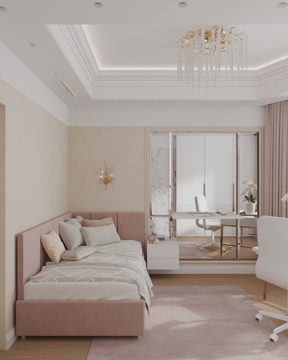 В детской для дочери использовали пудрово-розовые оттенки и декоративное панно с цветочным мотивом. Письменный стол на металлическом основании поставили у окна, создав удобную зону для учебы и блоггинга.