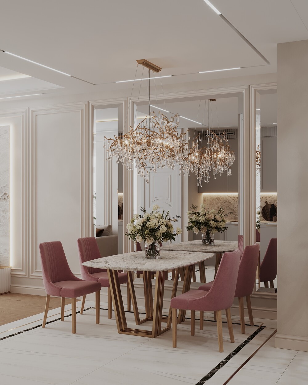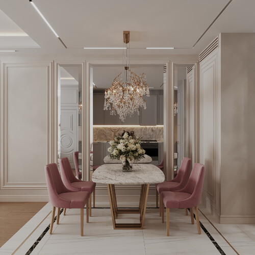 Над обеденным столом повесили акцентную люстру, которая визуально отделяет зону столовой. Стулья в пудрово-розовой обивке добавляют мягкости строгому классическому интерьеру.