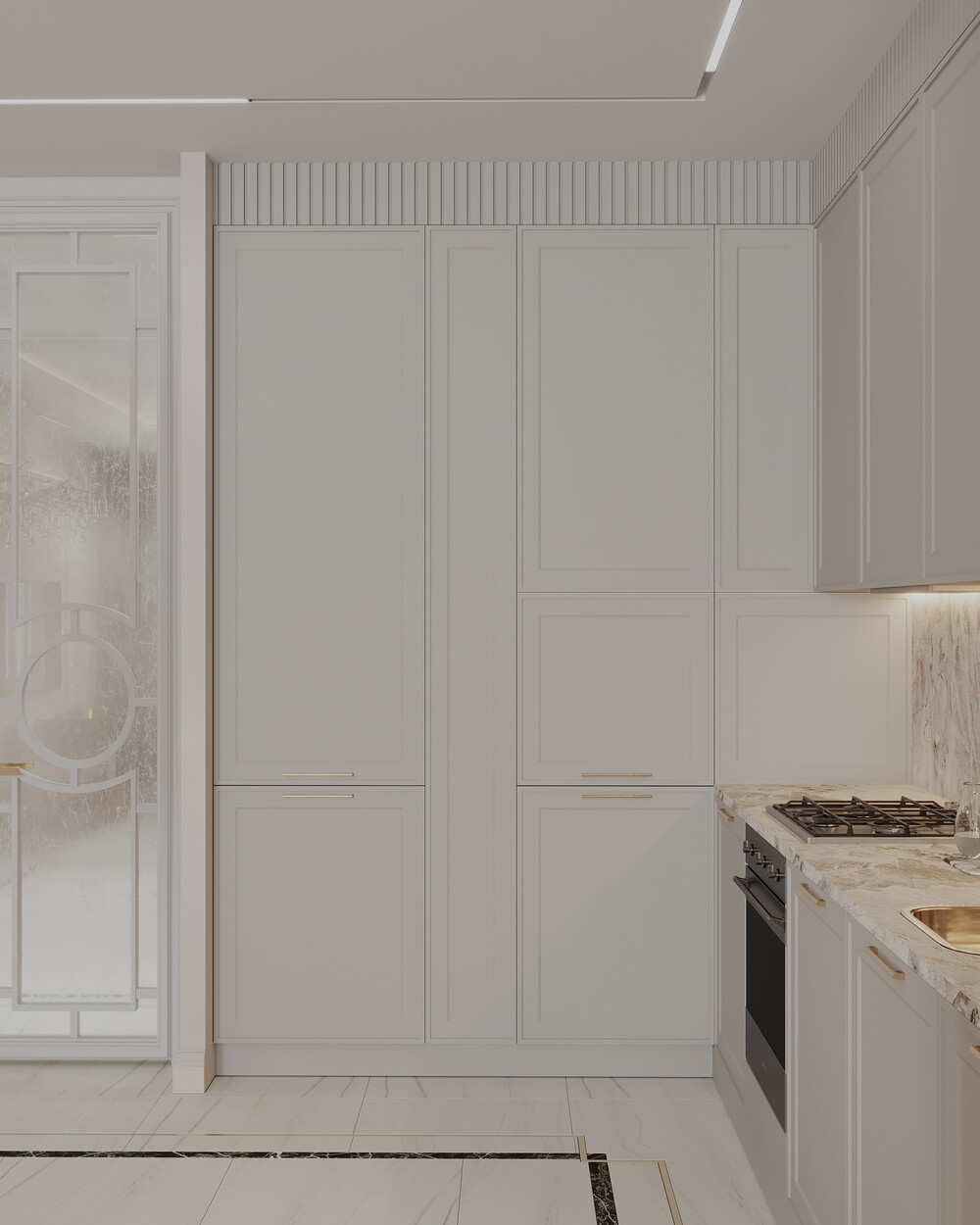 Кухонный гарнитур поддерживает общую стилистику за счет классической фрезеровки фасадов и встроенной техники. Столешницу и фартук подобрали из керамогранита с активным природным рисунком.