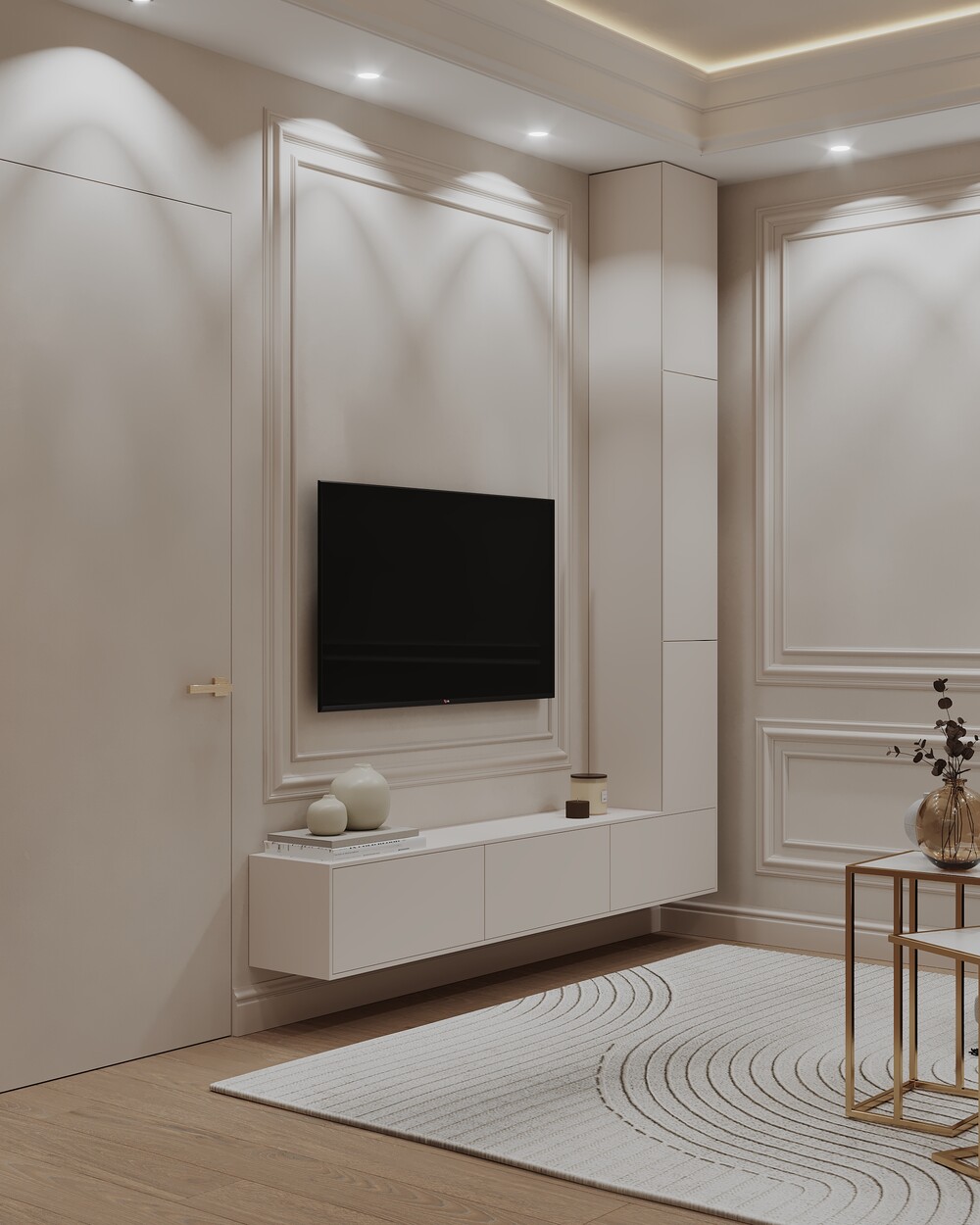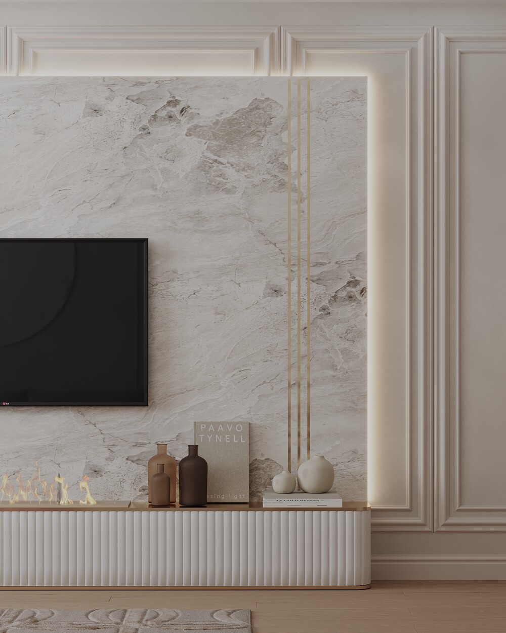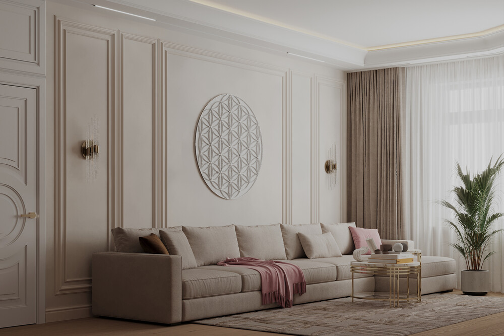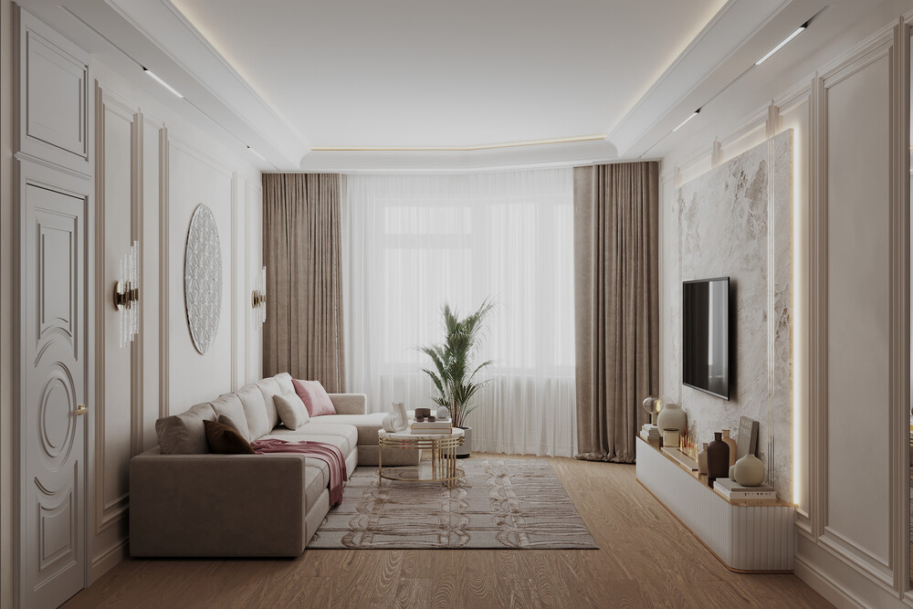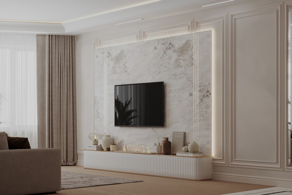 Для оформления выбрали светлую неоклассику с использованием молдингов и латунных деталей. Стену за телевизором отделали крупным камнем с мягкой контурной подсветкой.