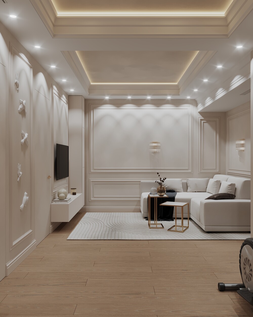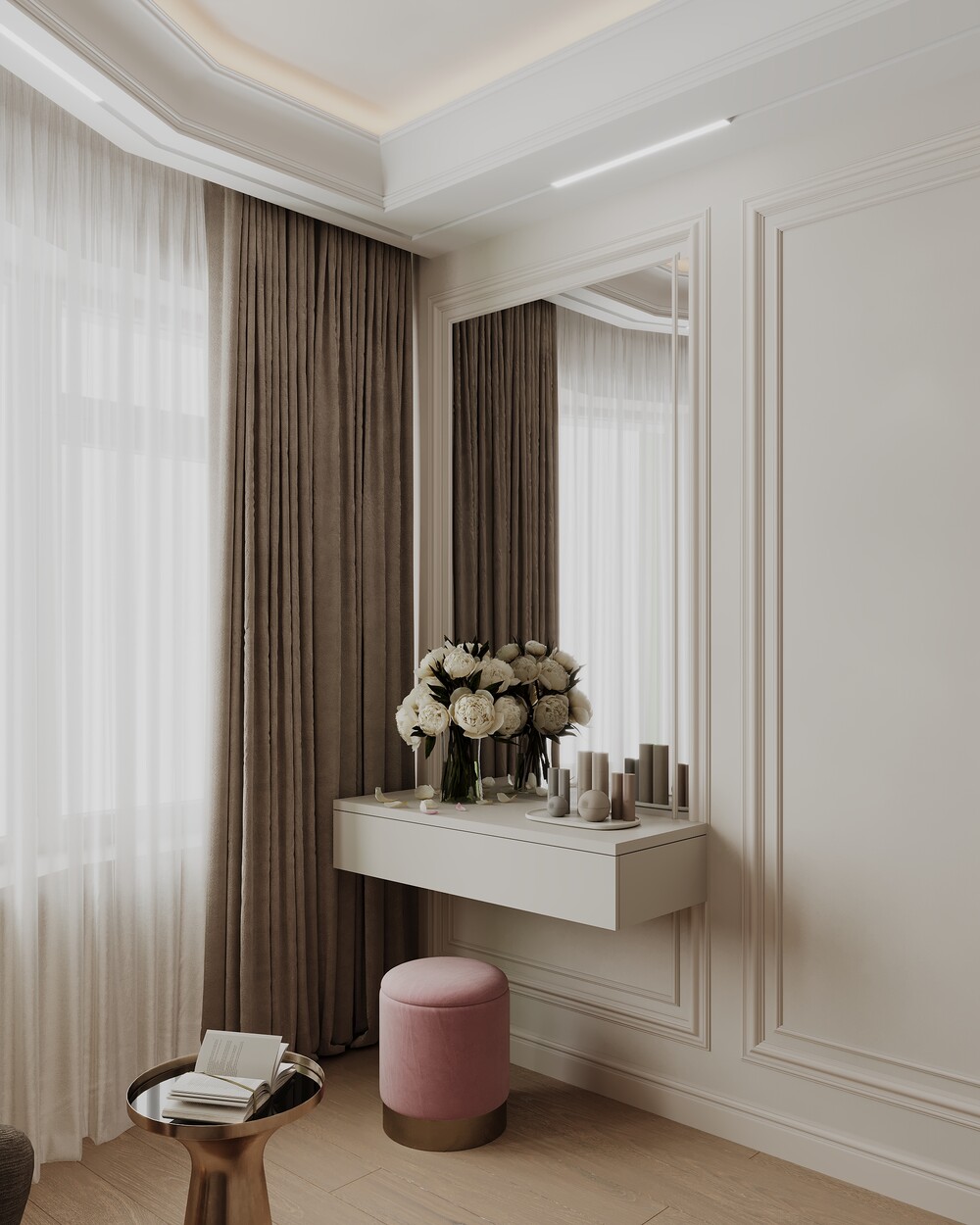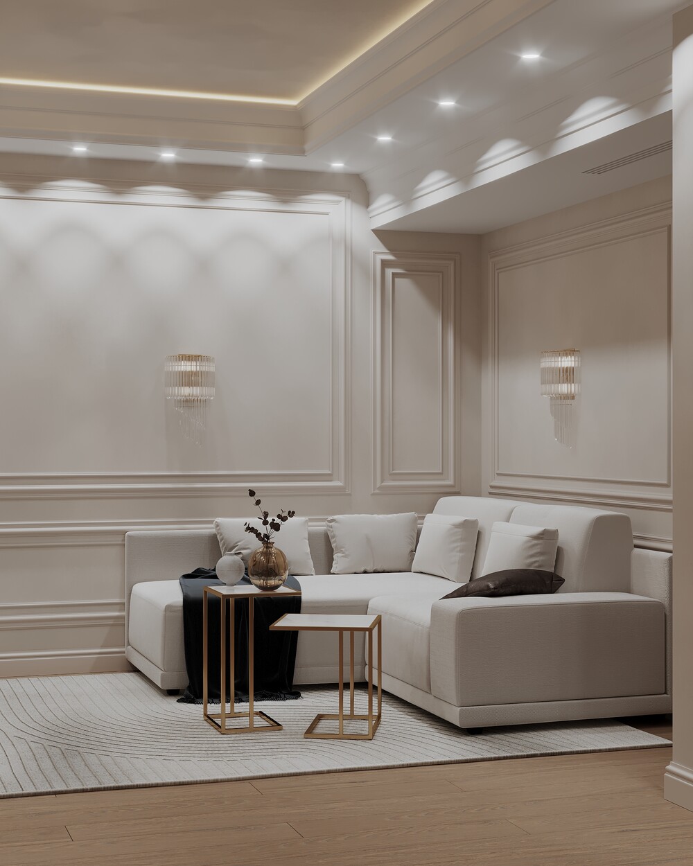 Для оформления выбрали светлую неоклассику с использованием молдингов и латунных деталей. Стену за телевизором отделали крупным камнем с мягкой контурной подсветкой.