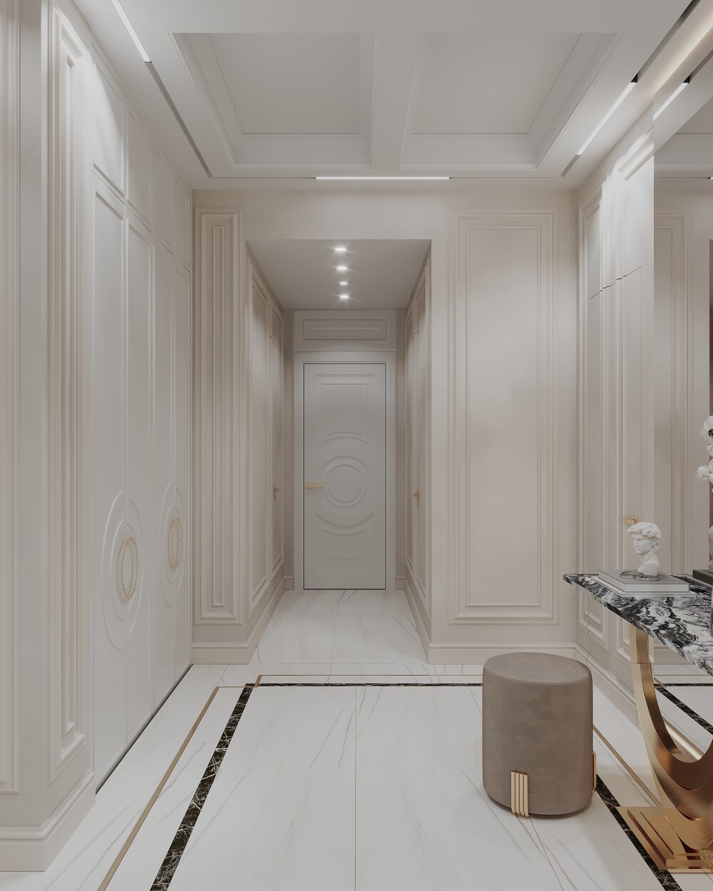 В холле мы обыграли несущую балку, скрыв её с помощью кессонного потолка из четырех секций с подсветкой. Шкафы встроили заподлицо со стенами, чтобы они не бросались в глаза и не сужали проход.