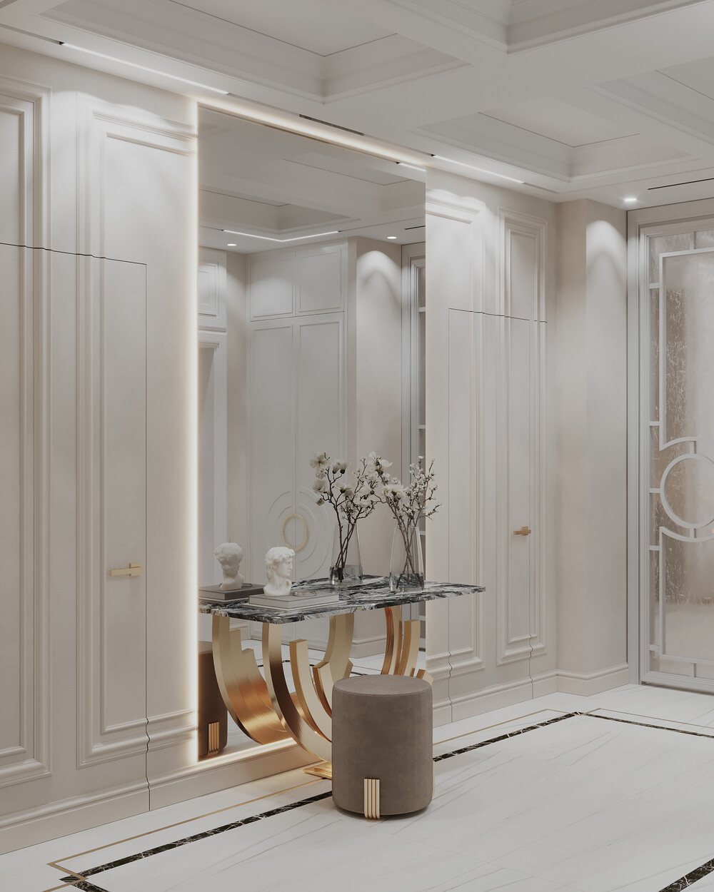 На полу выложили сложный рисунок из керамогранита с контрастным кантом по периметру. Консоль с каменным топом и большое зеркало при входе завершают парадный вид холла.