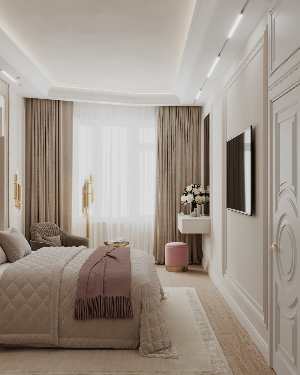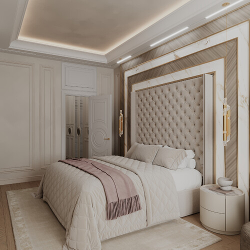 Комнату оформили в спокойных бежевых тонах с использованием стеновых панелей и латуни. Изголовье кровати выделили декоративным порталом со вставками под камень и скрытым светом.