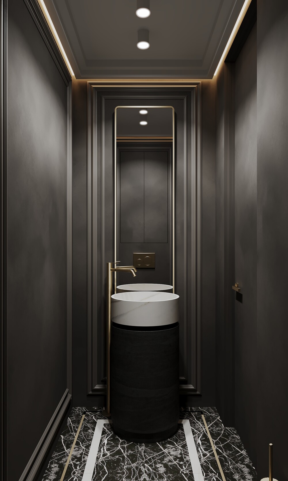 Раковину выбрали цилиндрической формы, установив ее под зеркалом в массивной декоративной раме. Латунные детали на темном фоне выглядят особенно эффектно и смело.