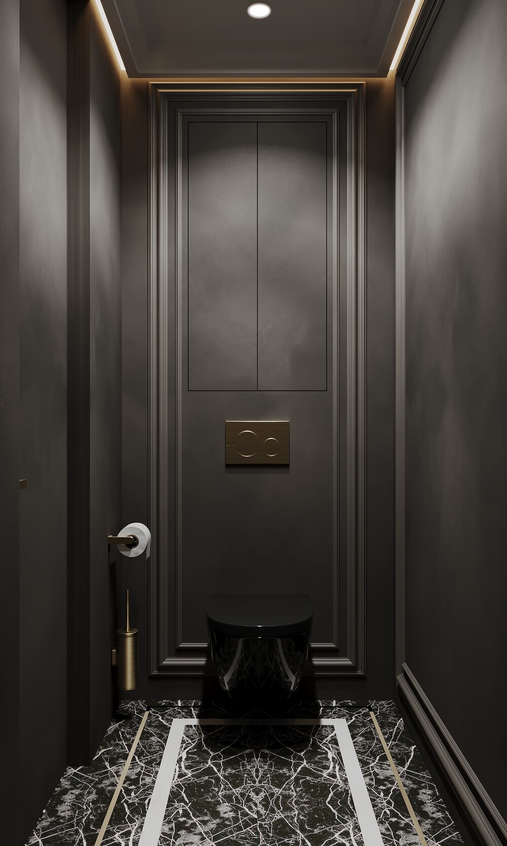 Второй санузел сделали контрастным: здесь преобладает темная гамма и строгие формы. Стены оформили панелями, а на полу использовали керамогранит с выразительной текстурой.