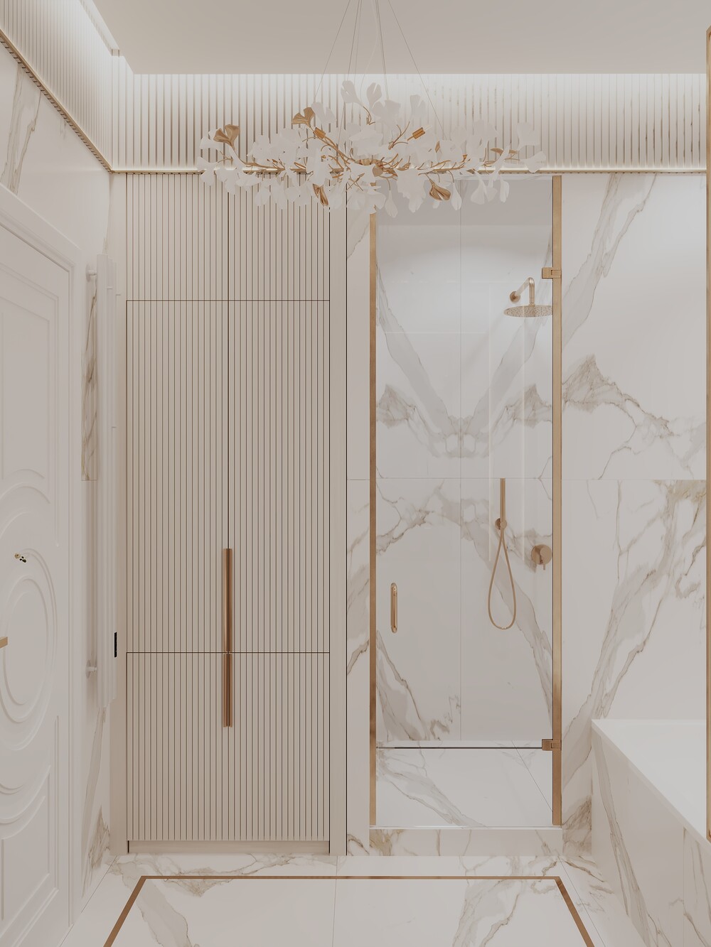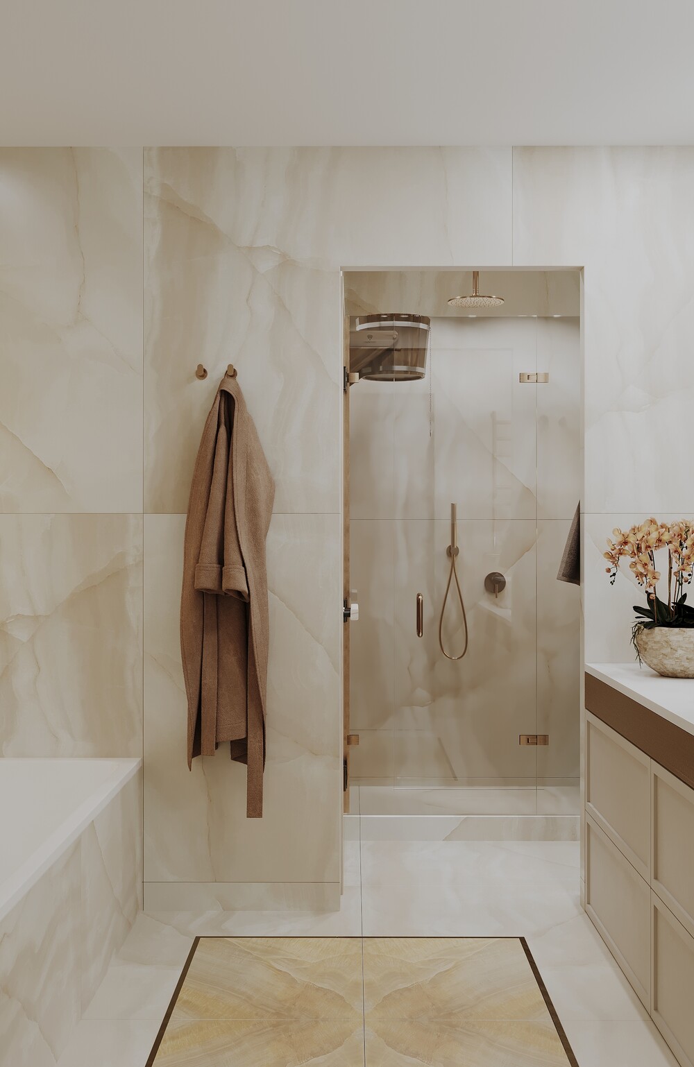 Стены облицевали мраморным керамогранитом, который сочетается с латунной сантехникой. Стеклянные перегородки защищают от брызг и не перекрывают вид на фактурную отделку.