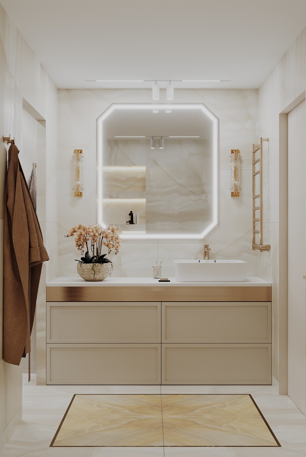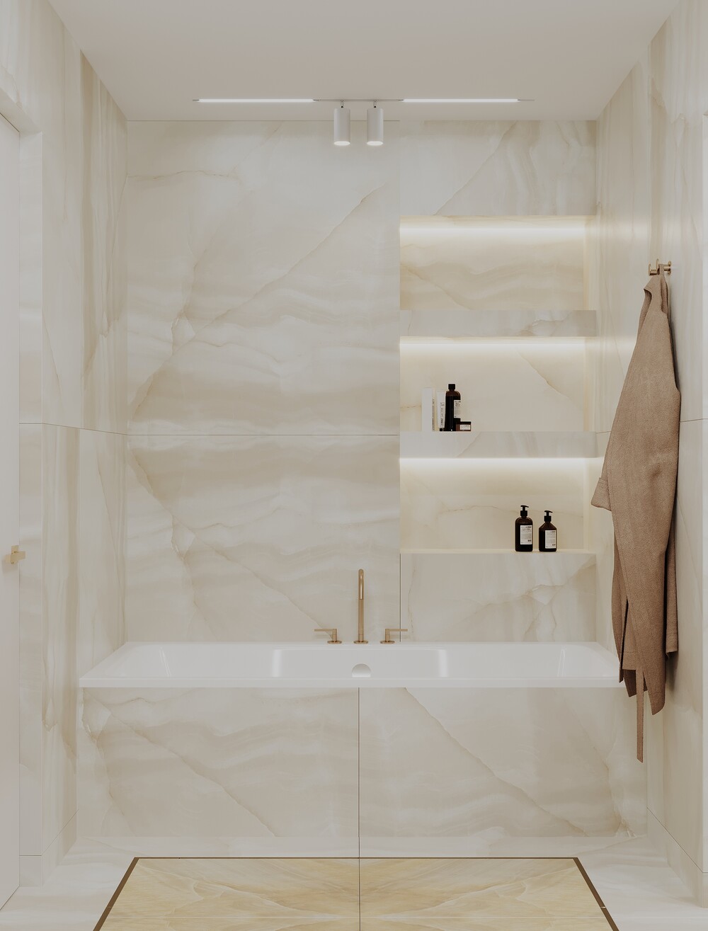 Для хранения ванных принадлежностей сделали скрытые ниши и широкую подвесную тумбу. Латунная сантехника и теплая подсветка по периметру добавляют интерьеру завершенности.