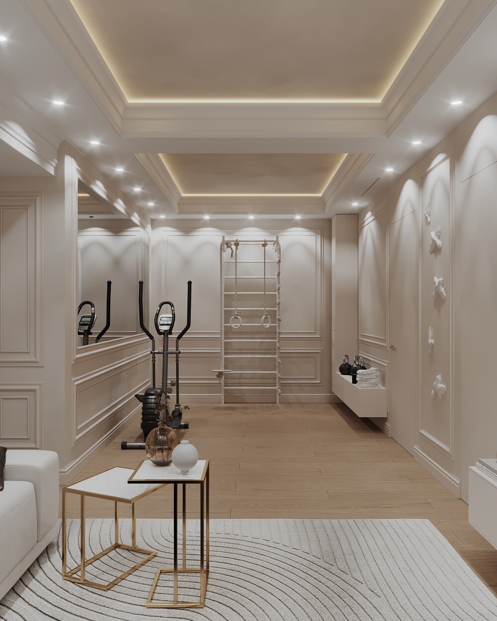 В глубине разместили шведскую стенку, эллипсоид и велотренажер для регулярных занятий спортом. Инженерная доска на полу и мягкий ковер делают пространство универсальным для любого использования.
