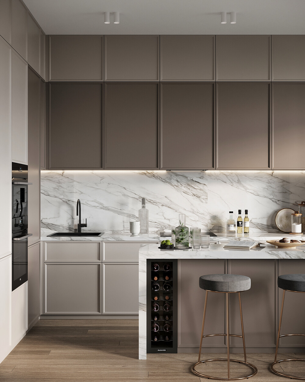 Мрамор (натуральный и керамогранит) — использован для столешниц и острова, создавая долговечные рабочие поверхности.