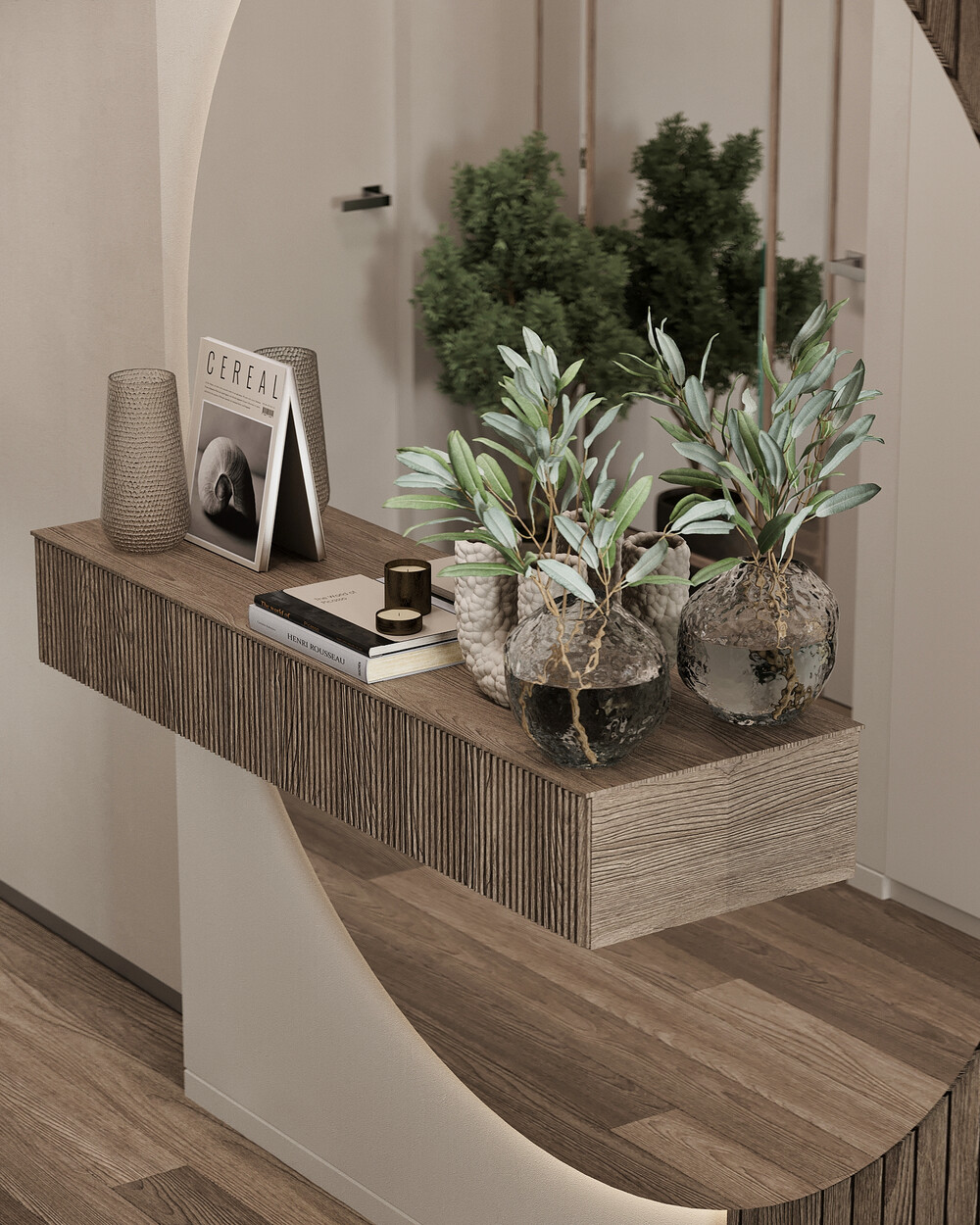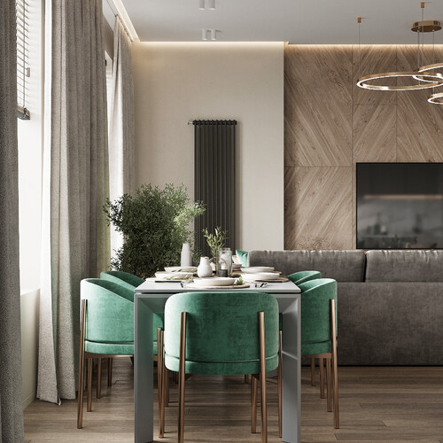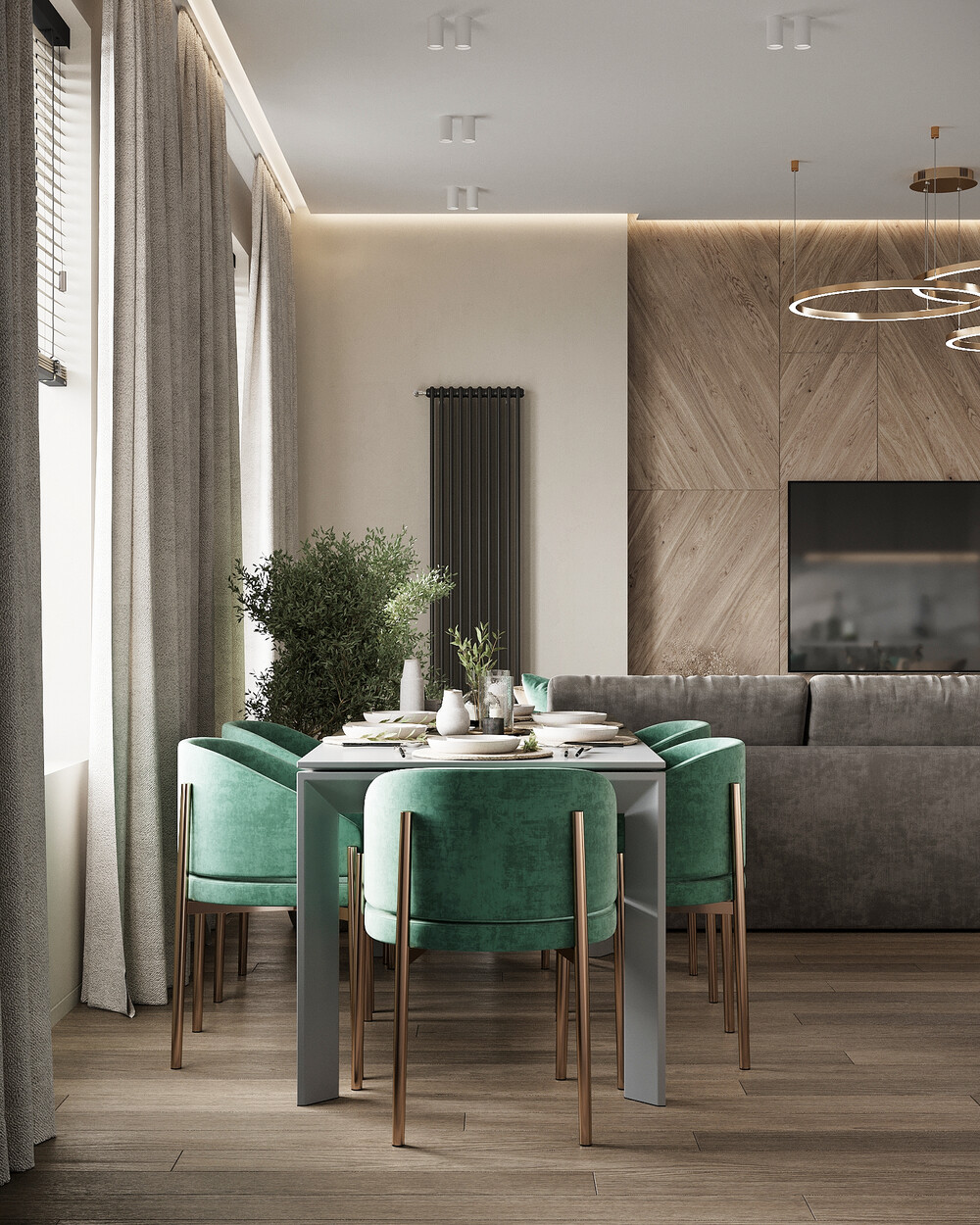 Интерьер выполнен в стиле современного минимализма. Базовые цвета проекта — теплый серый и капучино, которые создают нейтральный фон для акцентной мебели. В качестве контрастных элементов мы выбрали глубокий изумрудный оттенок для кресел и приглушенные землистые тона для текстиля. Медь и латунь в деталях светильников и ножках мебели добавляют интерьеру деликатный блеск.
