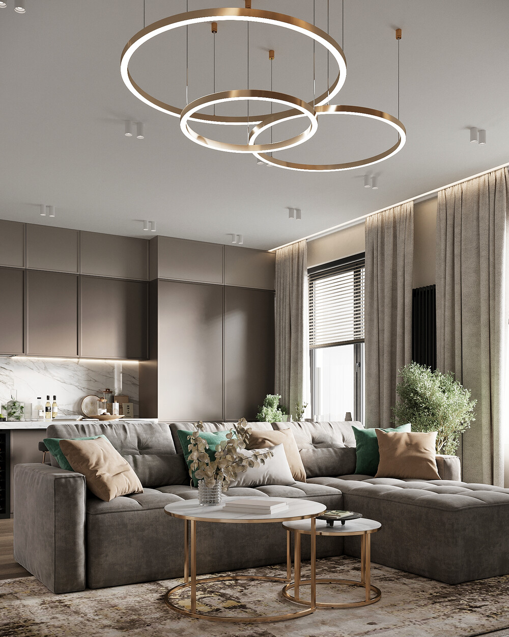 Кольцевые светильники — лаконичные золотистые обручи разного диаметра задают геометрию в зоне отдыха без перегрузки потолка.