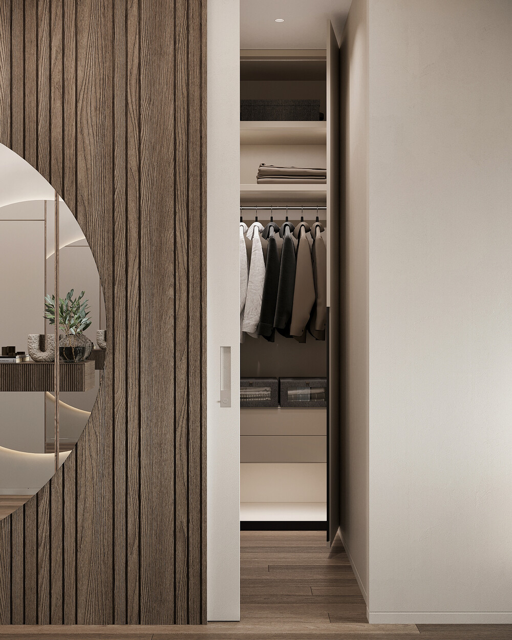 Здесь мы разместили основной объем хранения — вместительные шкафы от пола до потолка с лаконичными фасадами. Постирочную зону удалось вынести в холл, установив технику в один ряд с гардеробом за незаметной перегородкой.