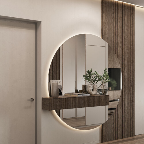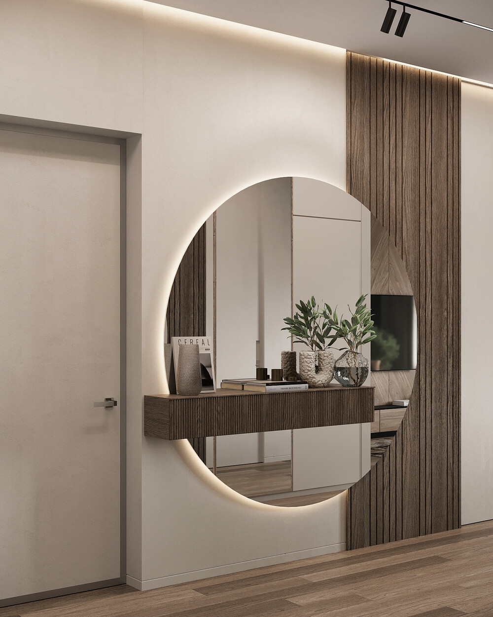 Натуральный шпон дерева — применен в отделке стеновых панелей и мебельных фасадов для создания природного рельефа.