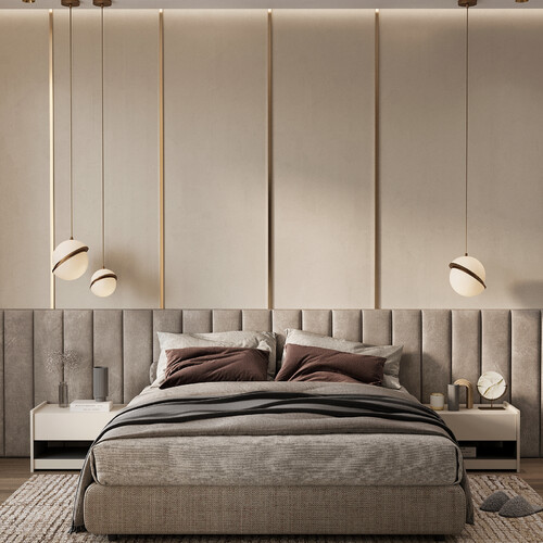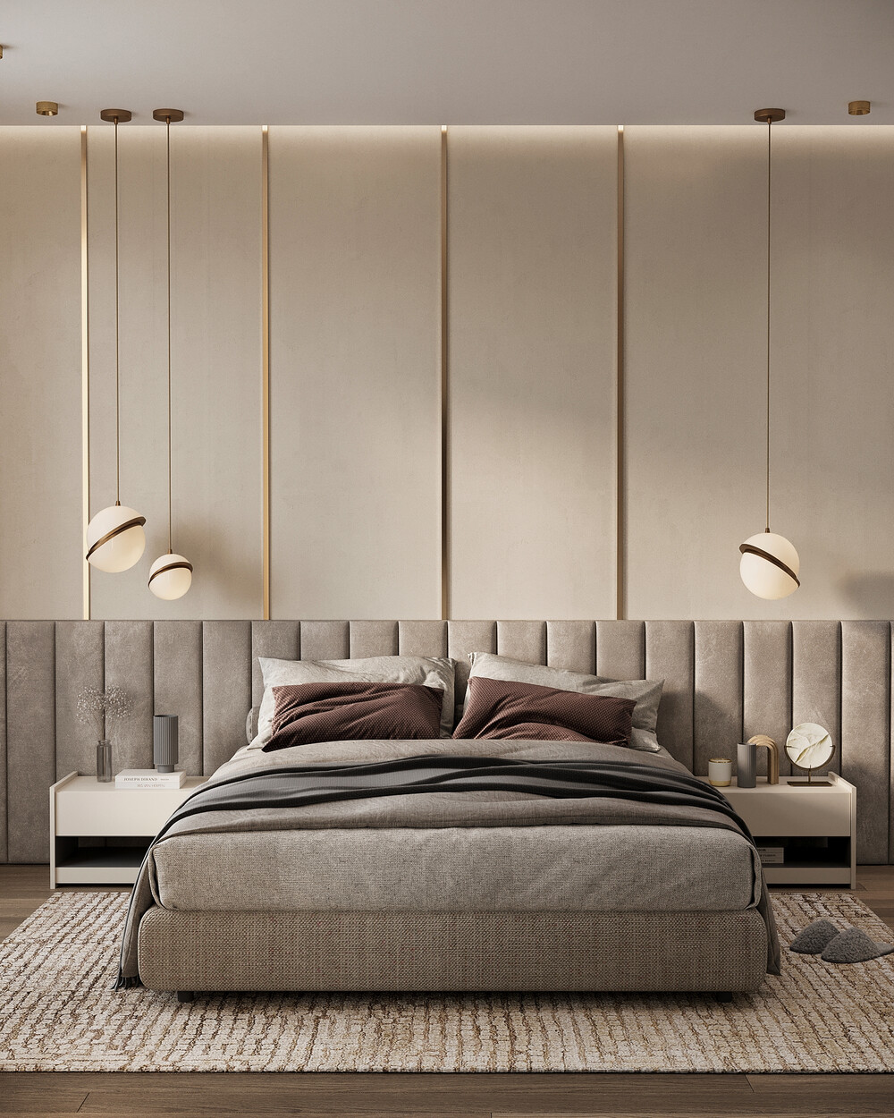 Кровать развернули относительно типовой планировки, открыв прямой вид из окна на внутренний двор. Мягкие панели в изголовье и натуральный текстиль добавляют тактильности, сохраняя при этом общую строгую геометрию.