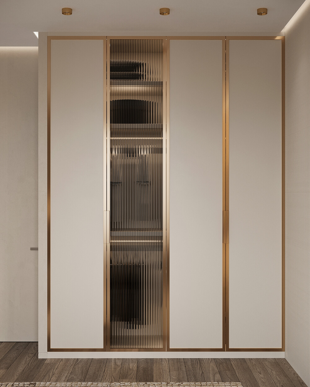 Такое решение позволило убрать шумные бытовые процессы из ванной комнаты и кухни. Золотистая фурнитура и скрытые двери-невидимки помогают прихожей выглядеть частью жилого интерьера, а не просто техническим узлом.