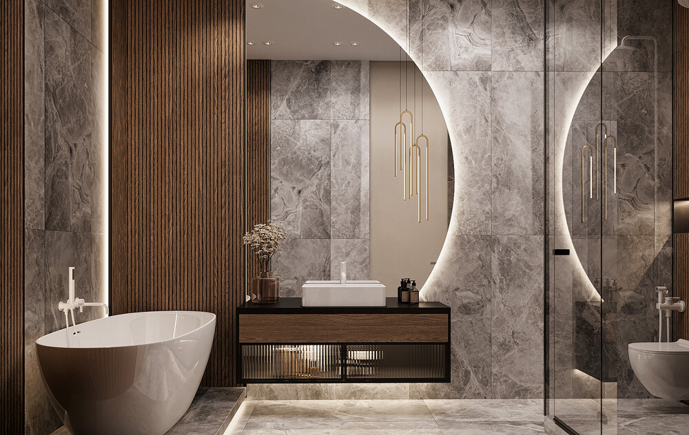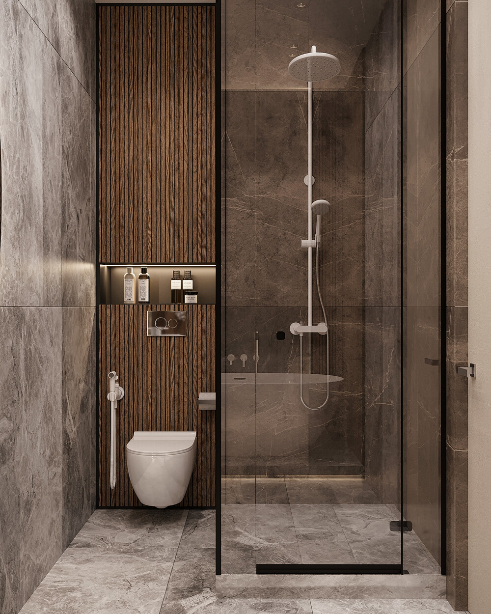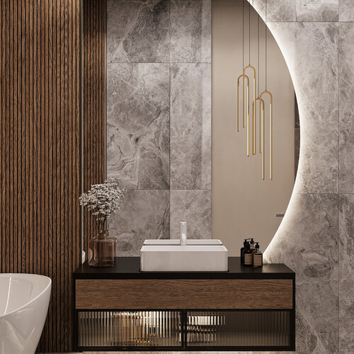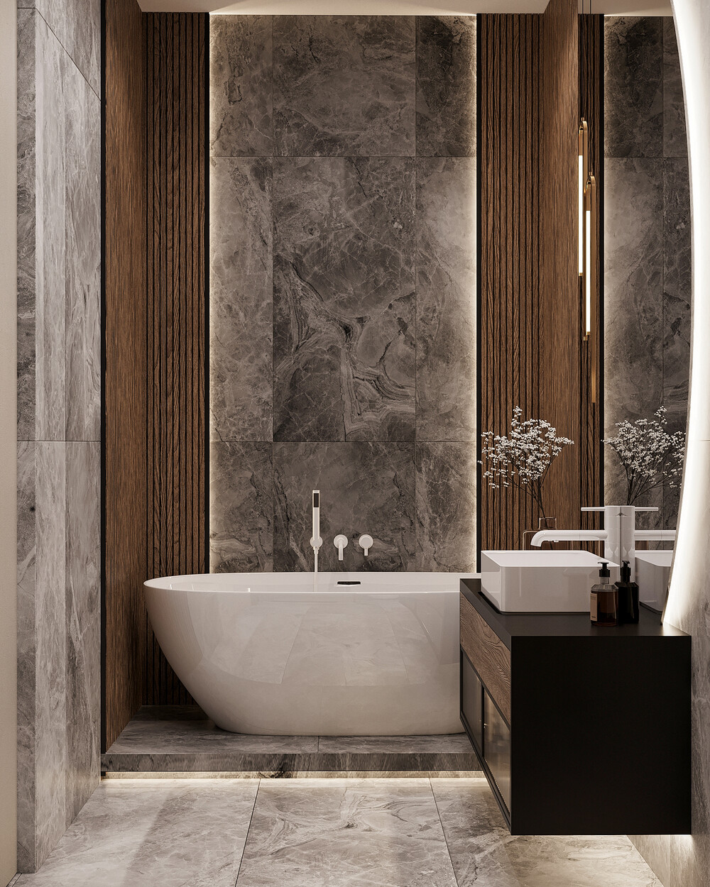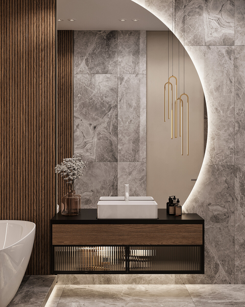 Для отделки выбрали крупноформатный керамогранит с текстурой камня, который практичен в уходе и долговечен. Графичные черные смесители и скрытая подсветка зеркал завершают современный образ комнаты.