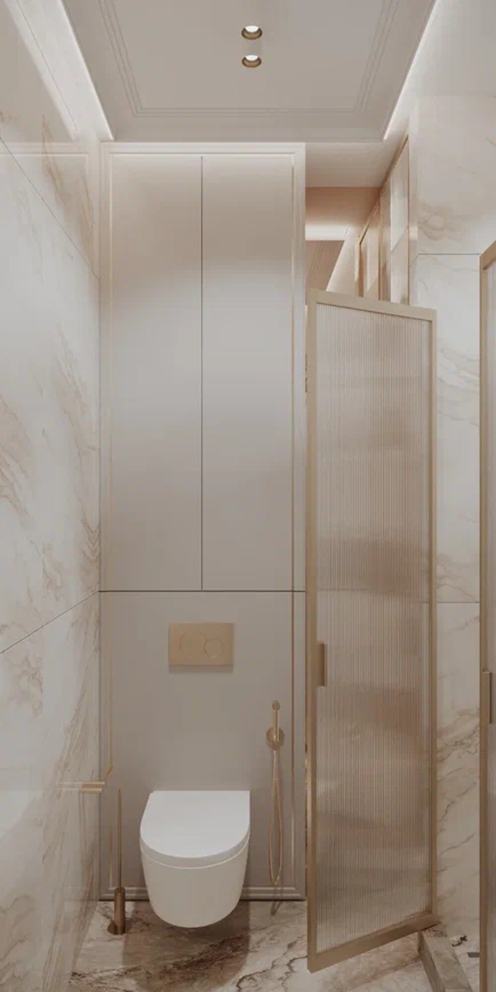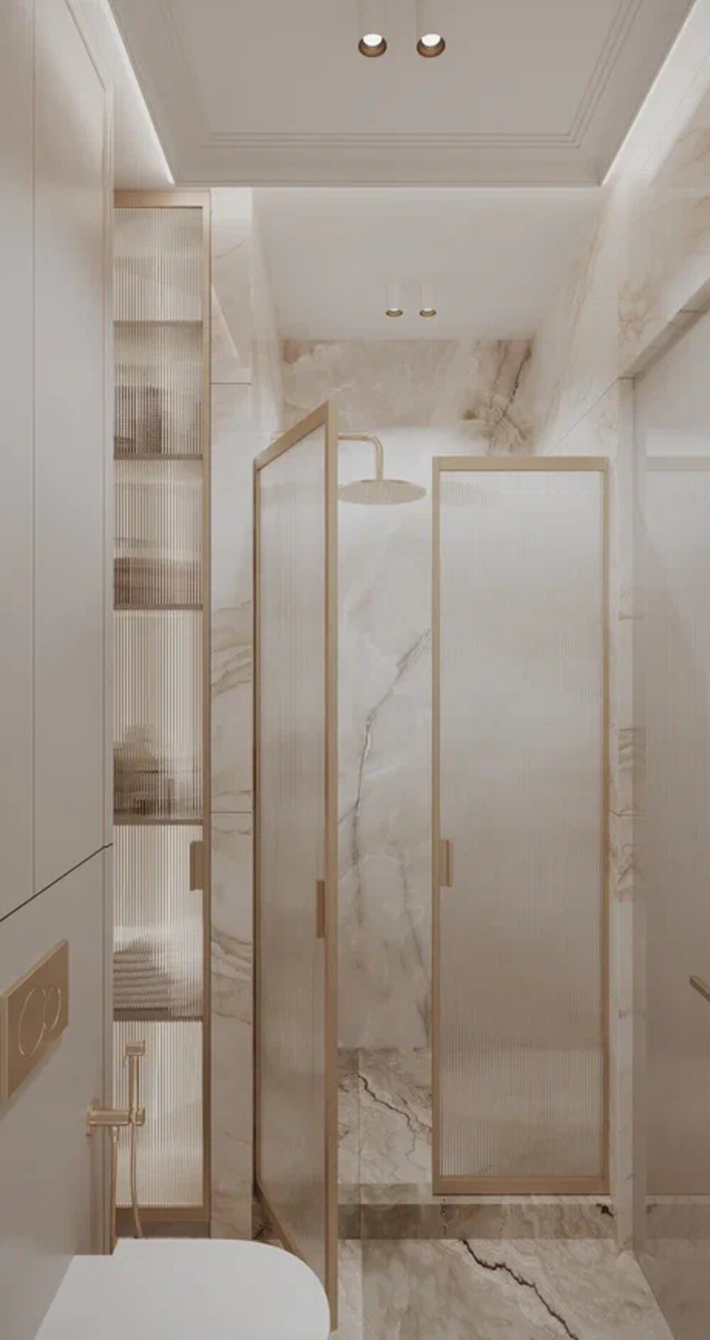 Гостевой санузел решён в светлой мраморной отделке с латунными акцентами, перекликаясь с мастер-ванной. Душевая зона сформирована стеклянными перегородками с рифлёной фактурой и латунным профилем — они зонируют пространство, сохраняя его визуальную лёгкость.