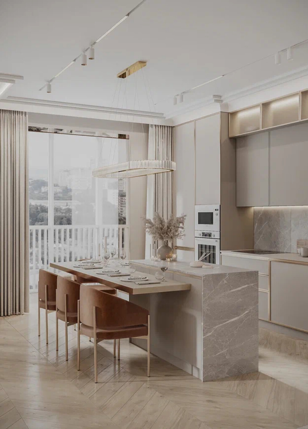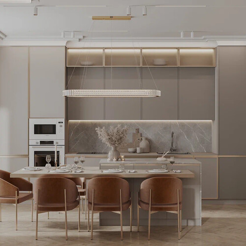Кухня выполнена в сдержанной палитре с акцентом на фактуры и латунную фурнитуру. Гарнитур выполнен в современной классике: фасады с деликатной фрезеровкой, встроенная техника и латунные профили поддерживают общую стилистику интерьера.