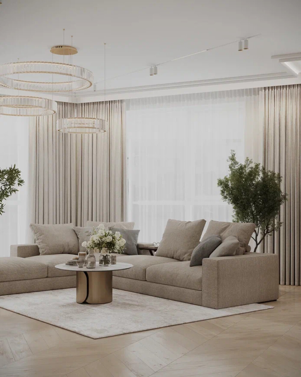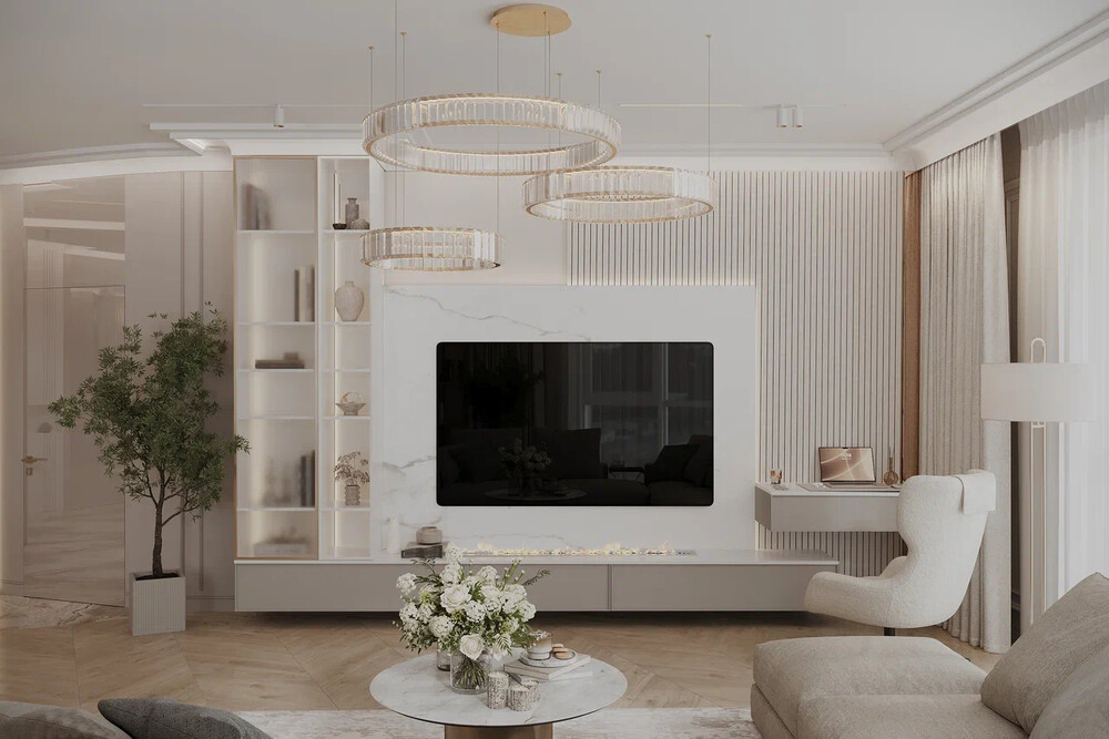 Гостиная оформлена в светлой карамельной гамме с элементами современной классики и арт-деко. Центральным акцентом стала ТВ-зона с камином, встроенным в мраморную панель, дополнена вертикальными панелями и встроенными витринами с подсветкой. Угловой диван, текстиль и столик с латунными деталями формируют цельную композицию.