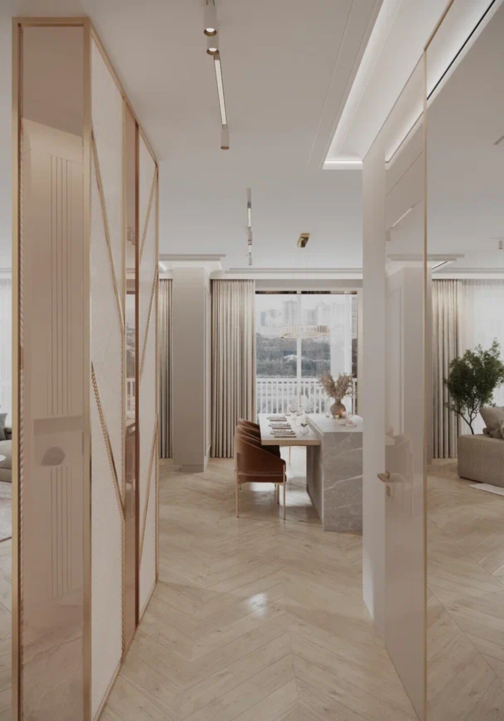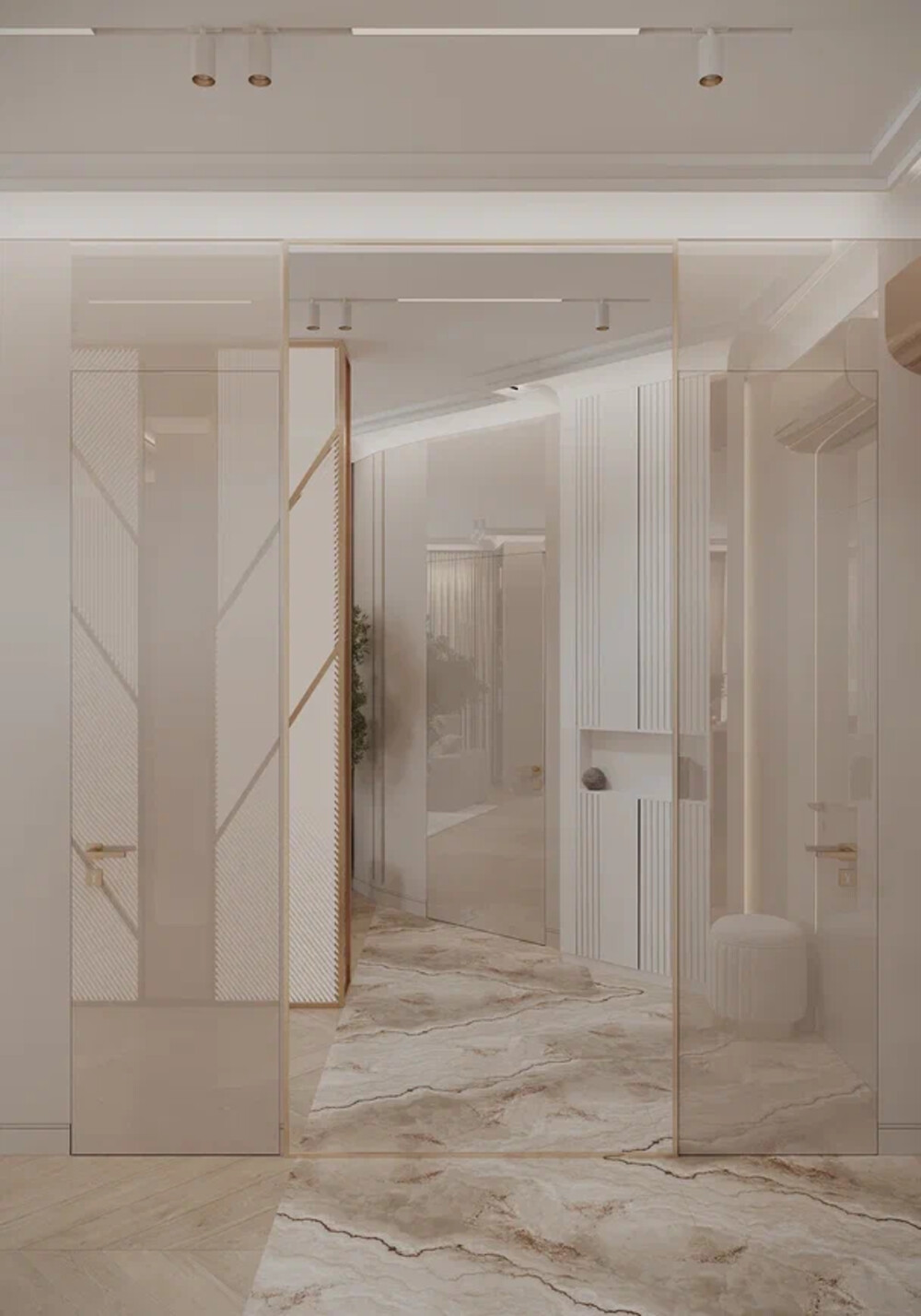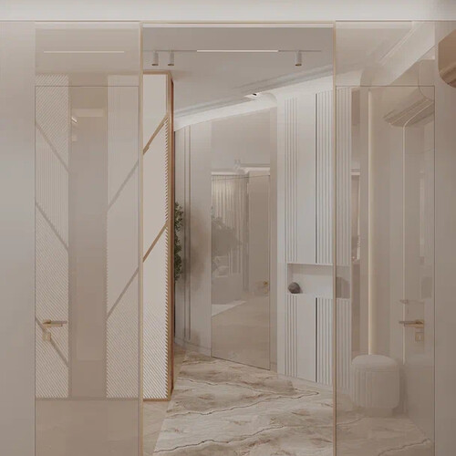 Прихожая оформлена в светлой гамме с активным использованием стекла, зеркал и латунных деталей. Объём у входа выстроен через сочетание глухих и прозрачных плоскостей: отражающие поверхности визуально расширяют пространство и связывают его с опенспейсом кухни-гостиной.