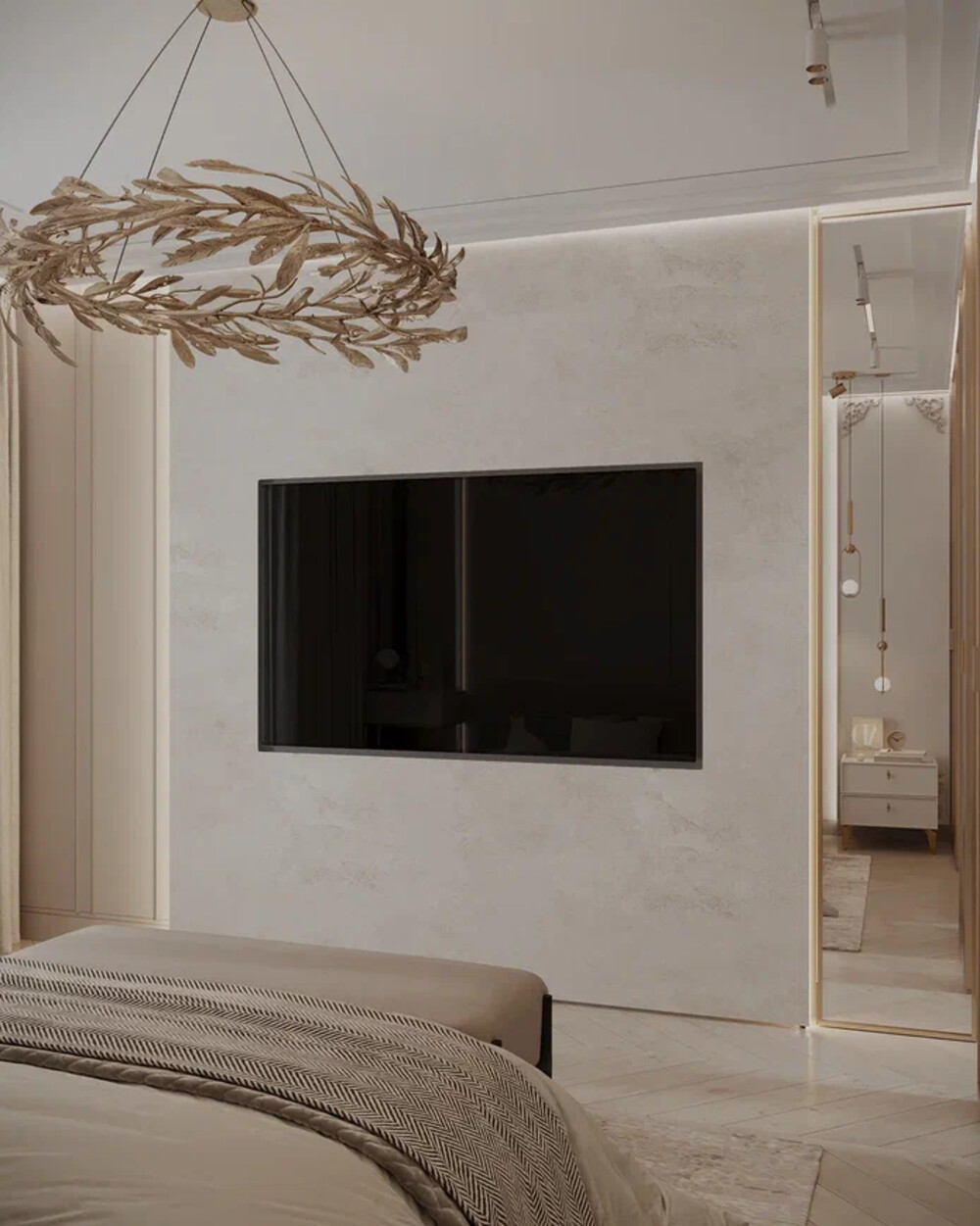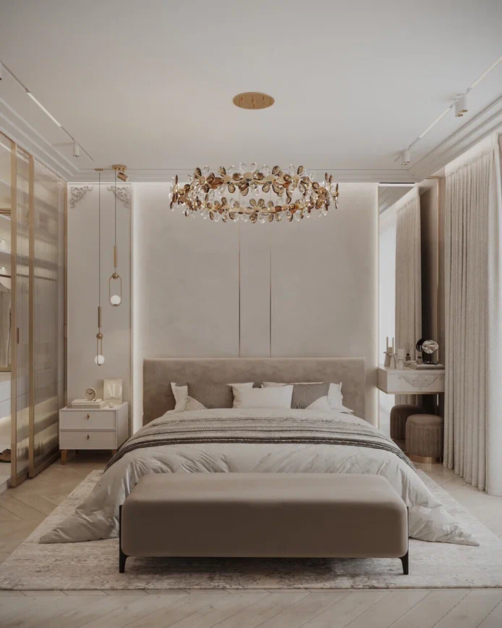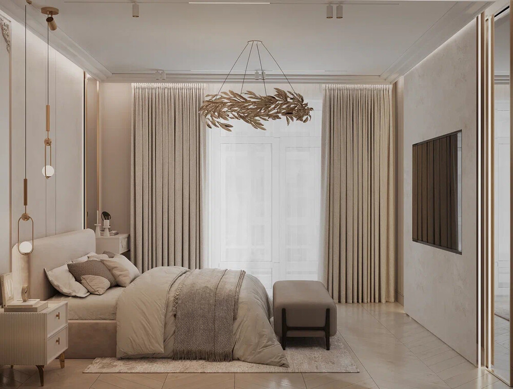Интерьер спальни выдержан в пудрово-бежевой гамме с мягкими фактурами и латунными деталями. Центром композиции стала кровать с высоким изголовьем, дополненная подвесными светильниками и выразительной люстрой. У окна разместили туалетный столик.