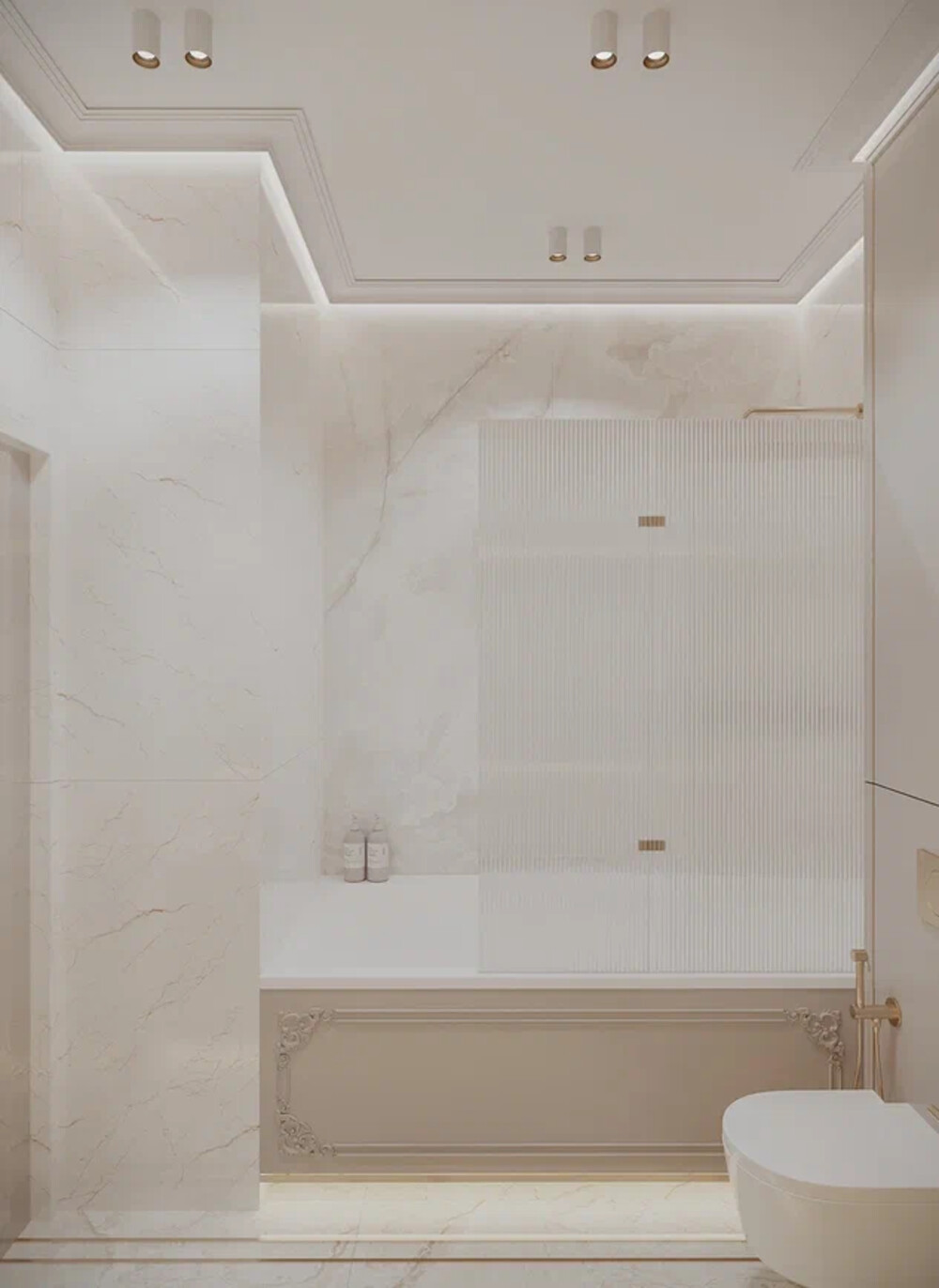 Основная ванная — в светлой мраморной гамме с акцентами матового золота. Ванна утоплена в нишу с декоративным экраном и рельефными элементами, стеклянная перегородка добавляет приватности.