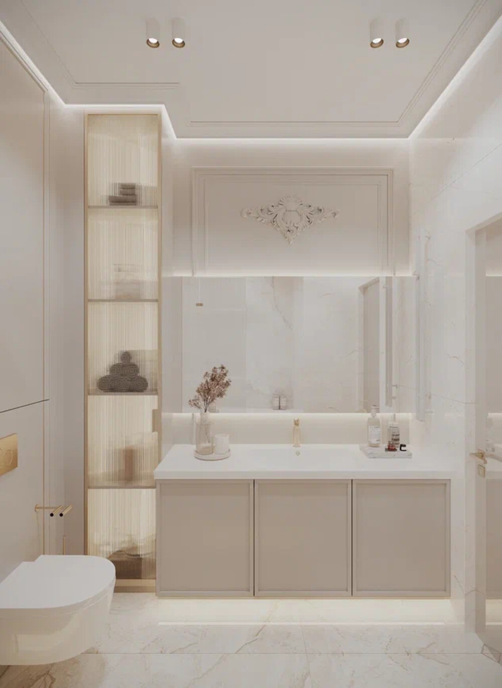 Вдоль стены разместили вместительную тумбу с раковиной и зеркалом с лепным декором и подсветкой. Узкая витрина со стеклянными фасадами служит местом хранения текстиля и аксессуаров, сохраняя лёгкость восприятия.