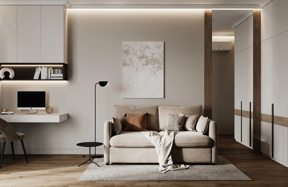 Помещение спроектировали как трансформер: комната служит и спальней, и рабочим кабинетом. Здесь стоит раскладной диван, закреплены настенные полки и организовано рабочее место прямо у окна.