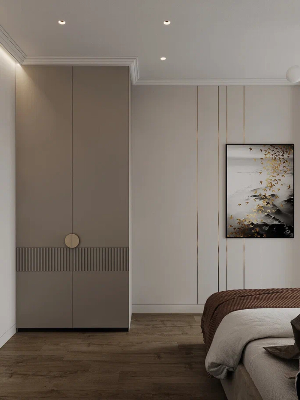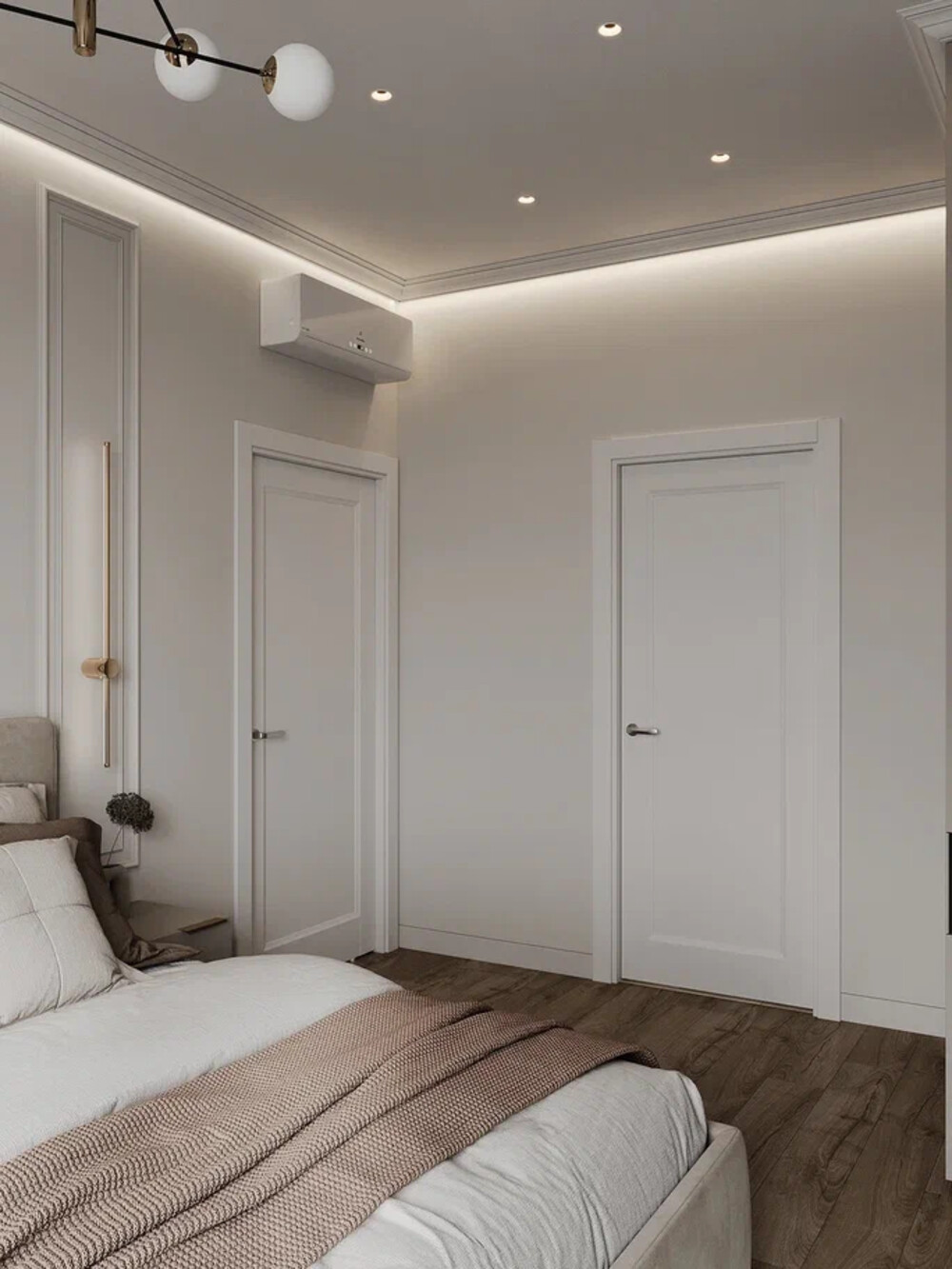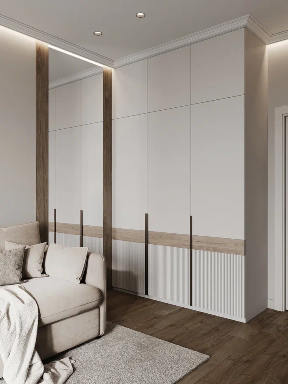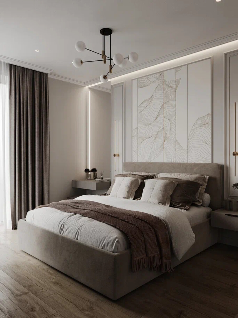 Главную спальню оформили в нейтральных тонах, сделав ставку на приятные на ощупь поверхности и направленный свет. Стену за изголовьем кровати выделили панелью с фрезеровкой и добавили точечные светильники, которые создают мягкую подсветку в нужных местах.