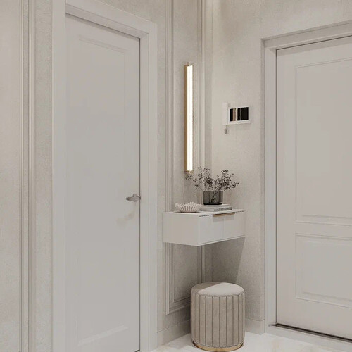 Прихожую оформили в светлом цвете с вертикальными световыми линиями и встроенными шкафами от пола до потолка. Огромное зеркало и двери скрытого монтажа помогают сделать пространство визуально шире.