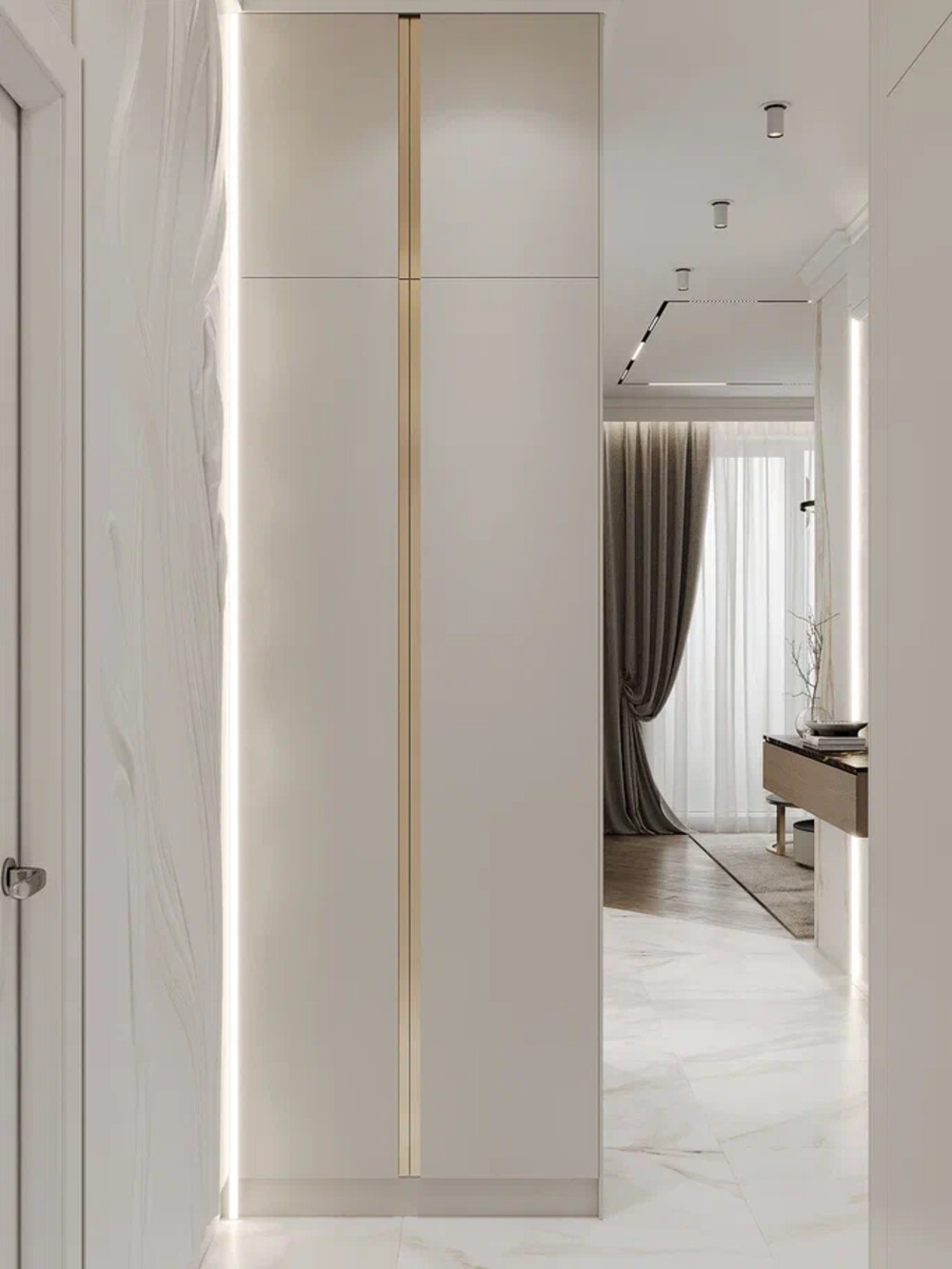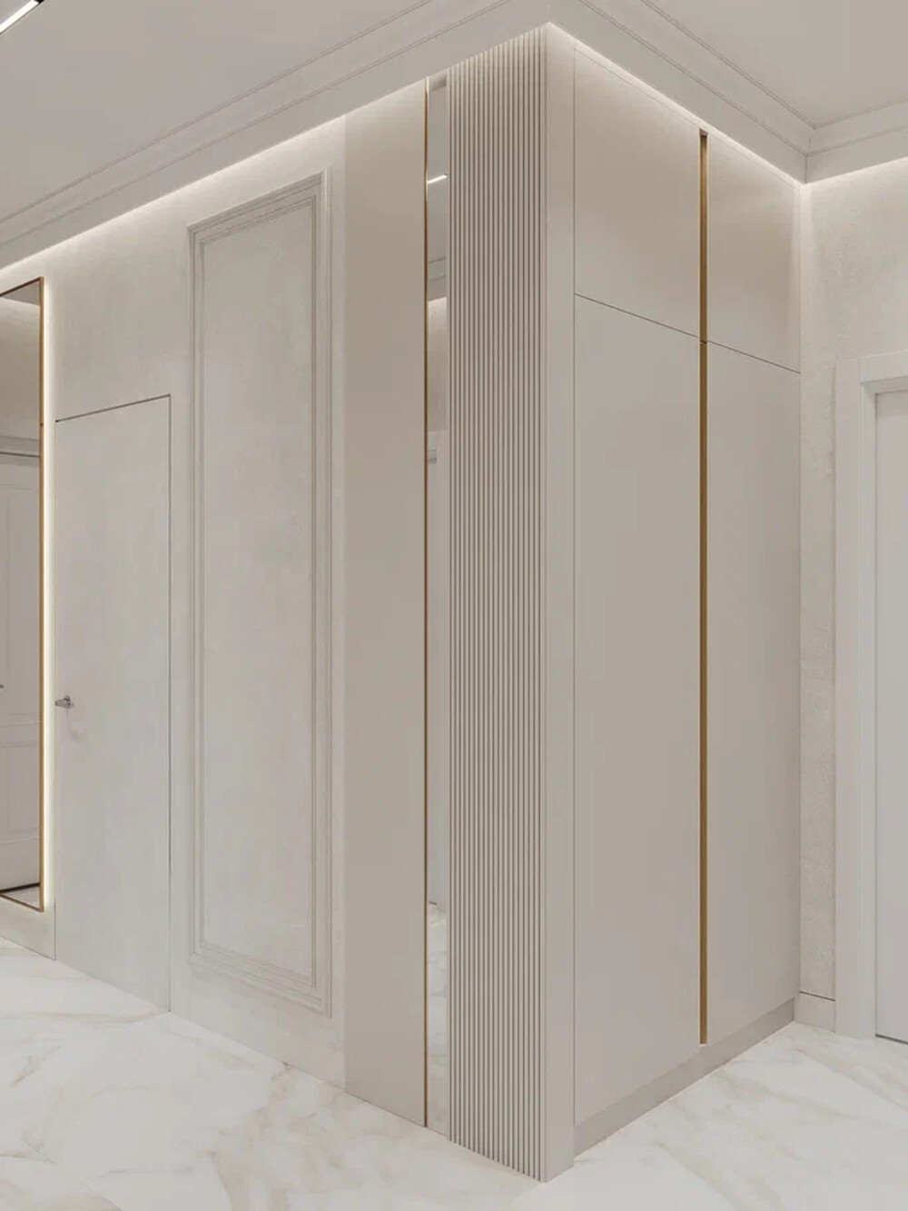 Для отделки выбрали краску и фактурные панели, которые дополнили деталями из латуни. Все системы хранения вписаны в геометрию коридора так, чтобы не мешать проходу.