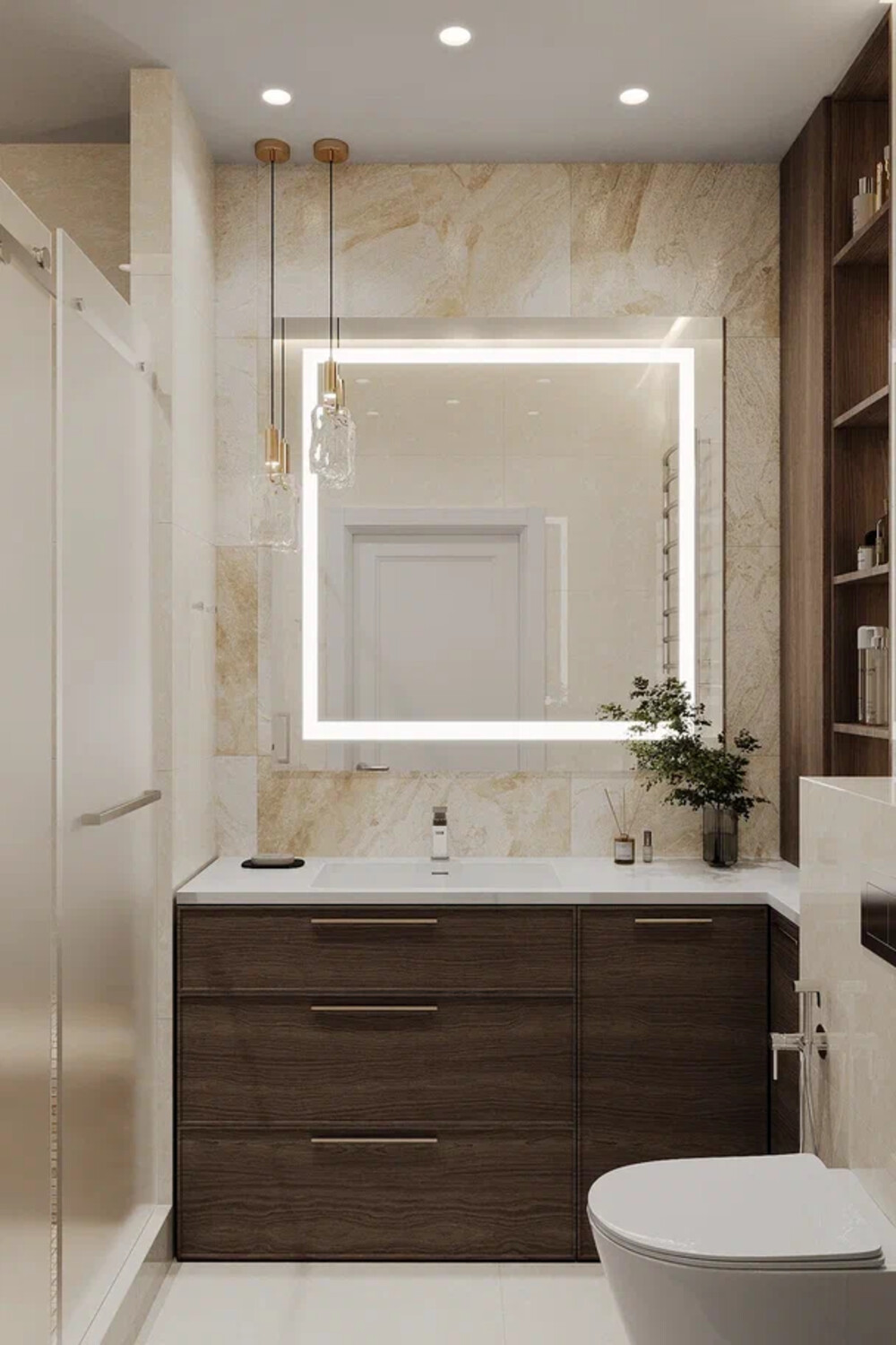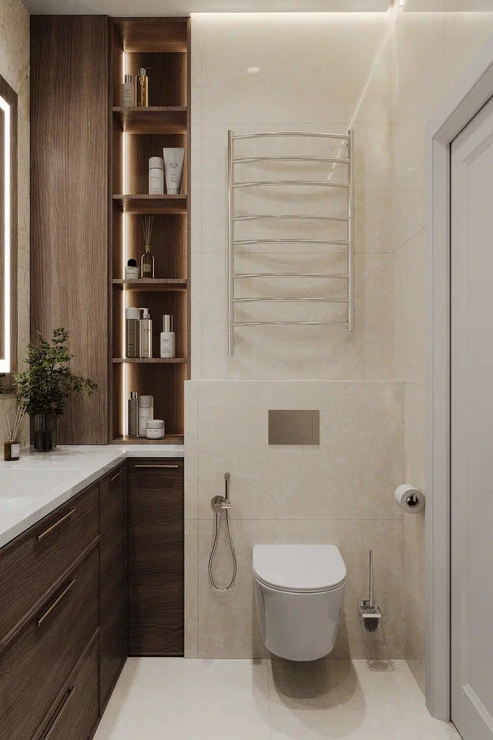 Саму ванну объединили с душем, установили большое зеркало с подсветкой для объема и тумбу под раковину для мелочей. Интерьер получился симметричным, а светлые материалы помогли визуально увеличить площадь.
