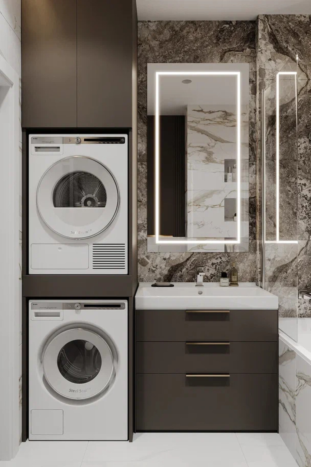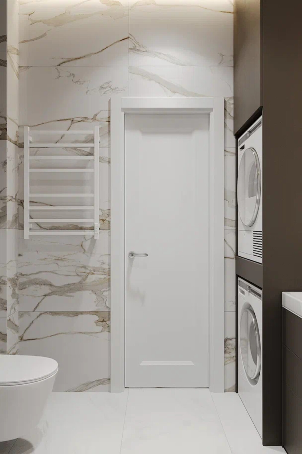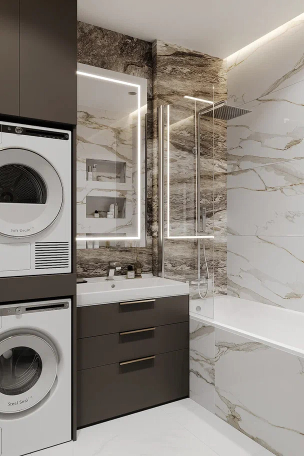 Вторую ванную сделали в спокойных серо-бежевых оттенках с использованием плитки под мрамор. Стиральную и сушильную машины спрятали в высокий шкаф, чтобы техника не бросалась в глаза.