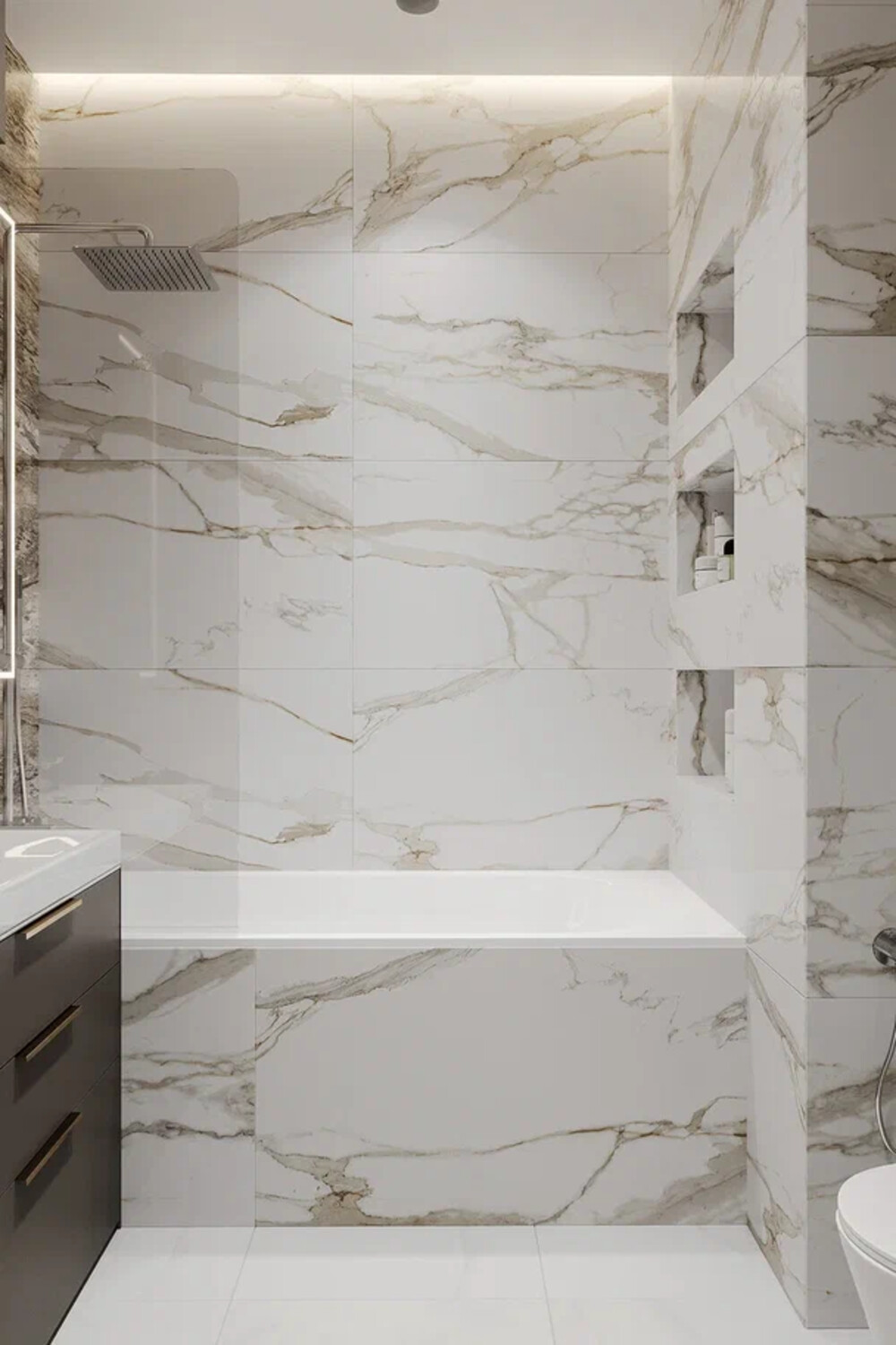 Душевую кабину выделили отдельной перегородкой, где встроили ниши для ванных принадлежностей и удобное сиденье. Стены облицевали крупноформатным керамогранитом, который в точности передает фактуру камня. Подсветку вмонтировали прямо в ниши, всю сантехнику спрятали в стены, установили потолочный душ, который подчеркивает строгий стиль интерьера квартиры.