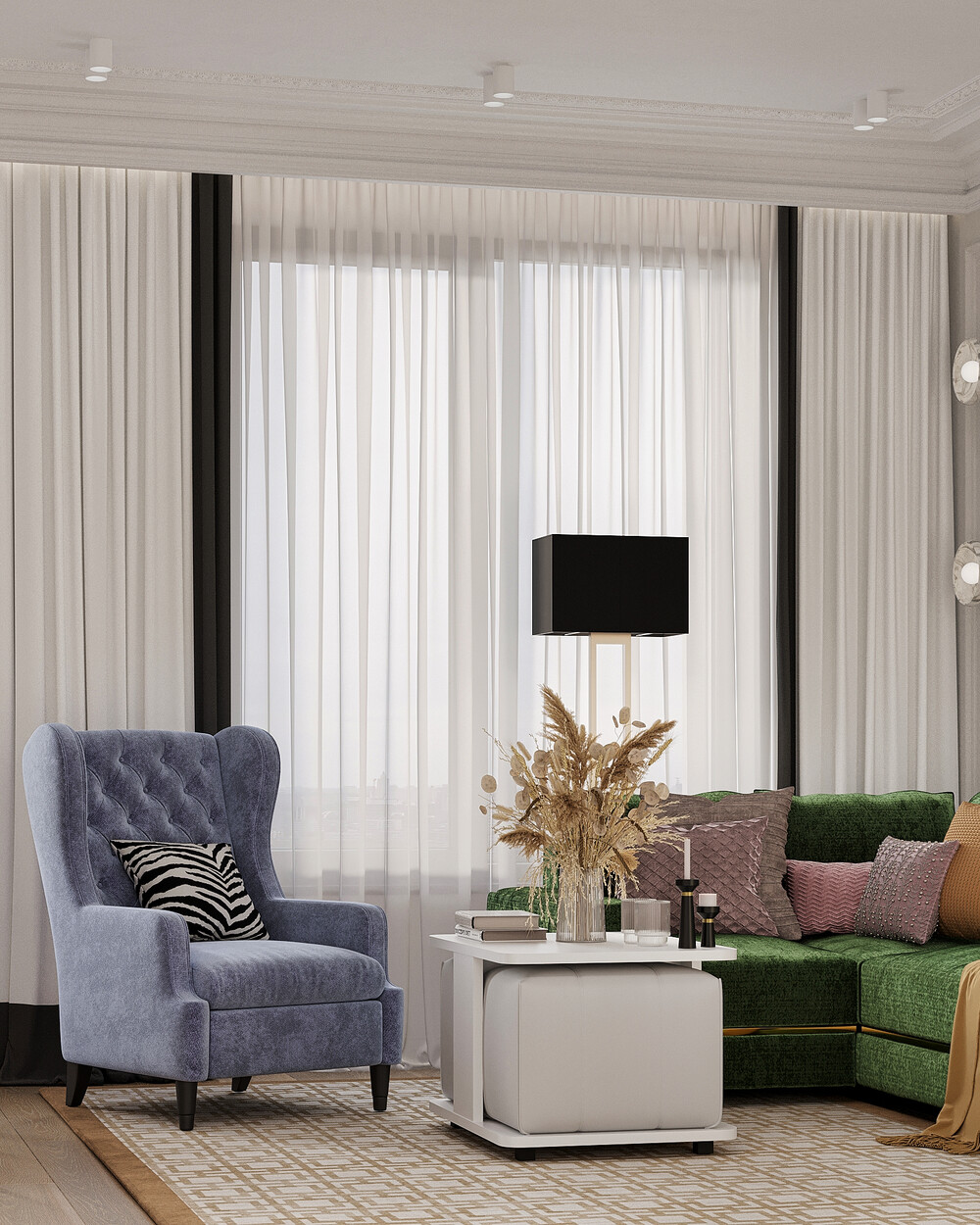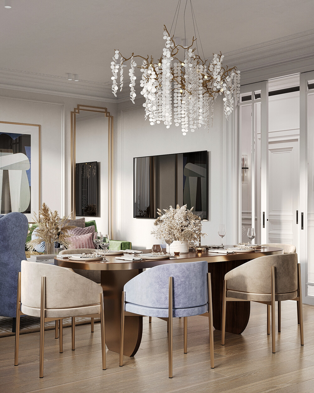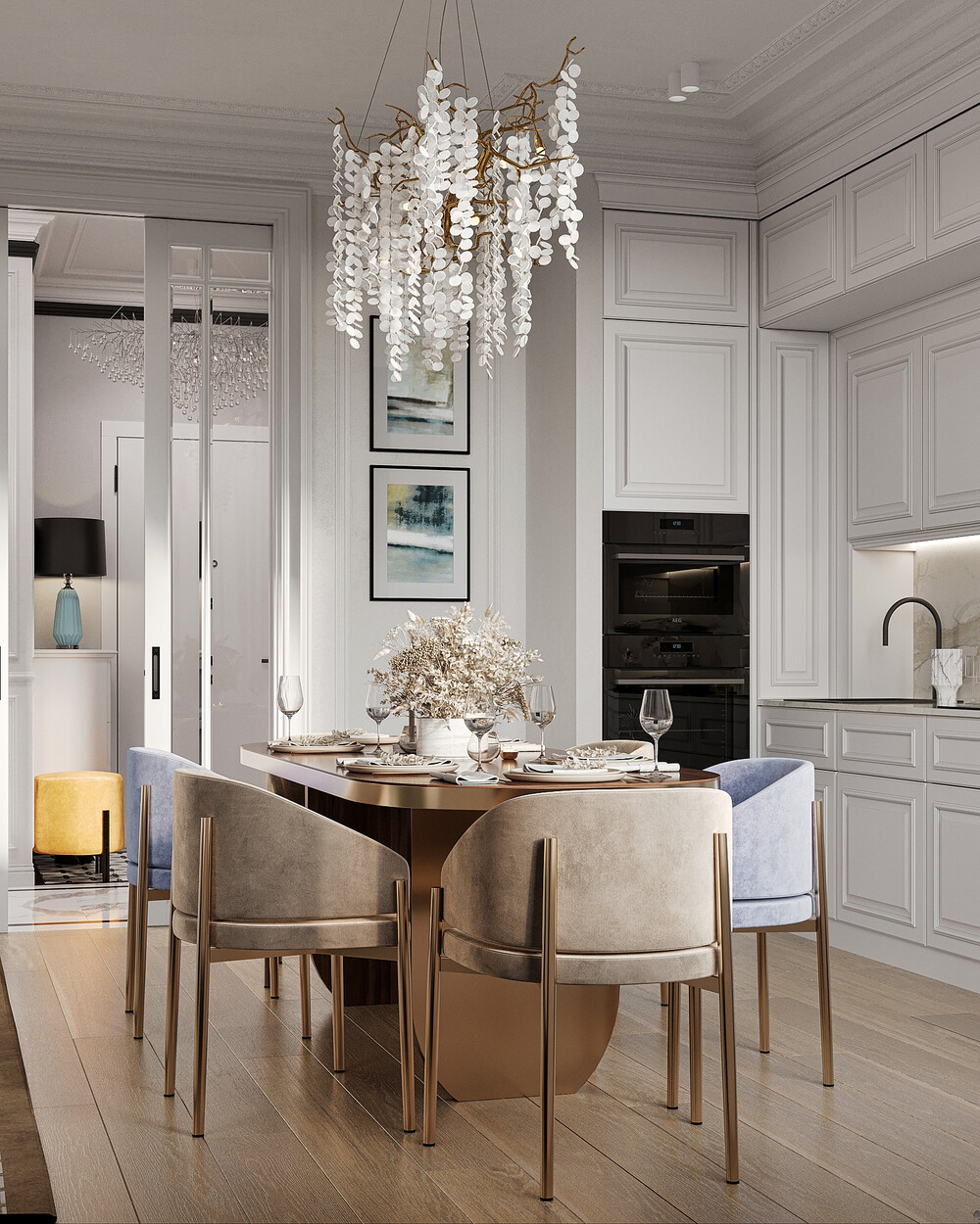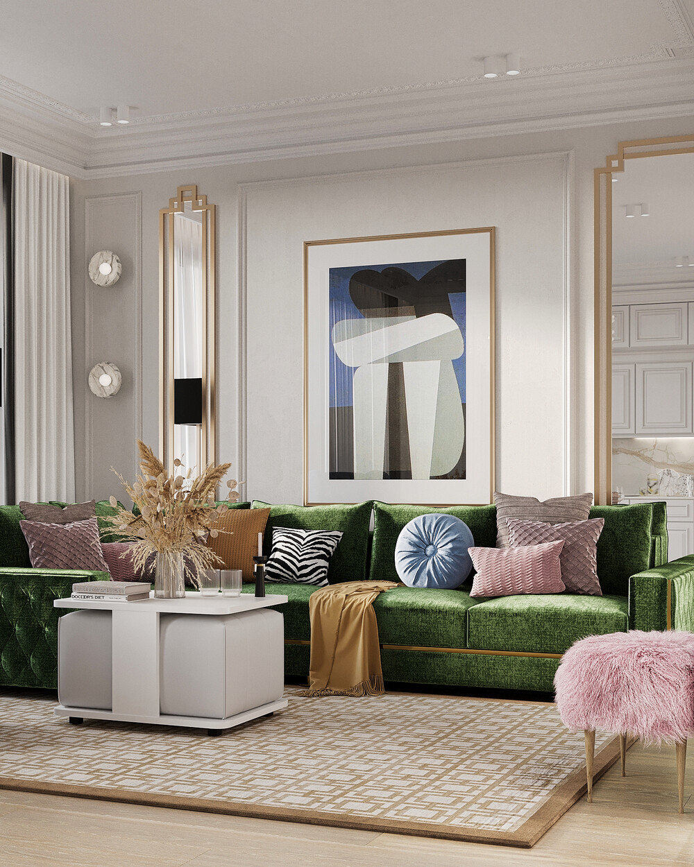 Интерьер выполнен в современном стиле с элементами неоклассики и ар-деко. Цветовая база построена на молочно-белых и теплых серых оттенках, которые делают пространство светлее и визуально просторнее. Синие, зеленые и розовые акценты добавлены через мебель и декор, чтобы сохранить цельность оформления.