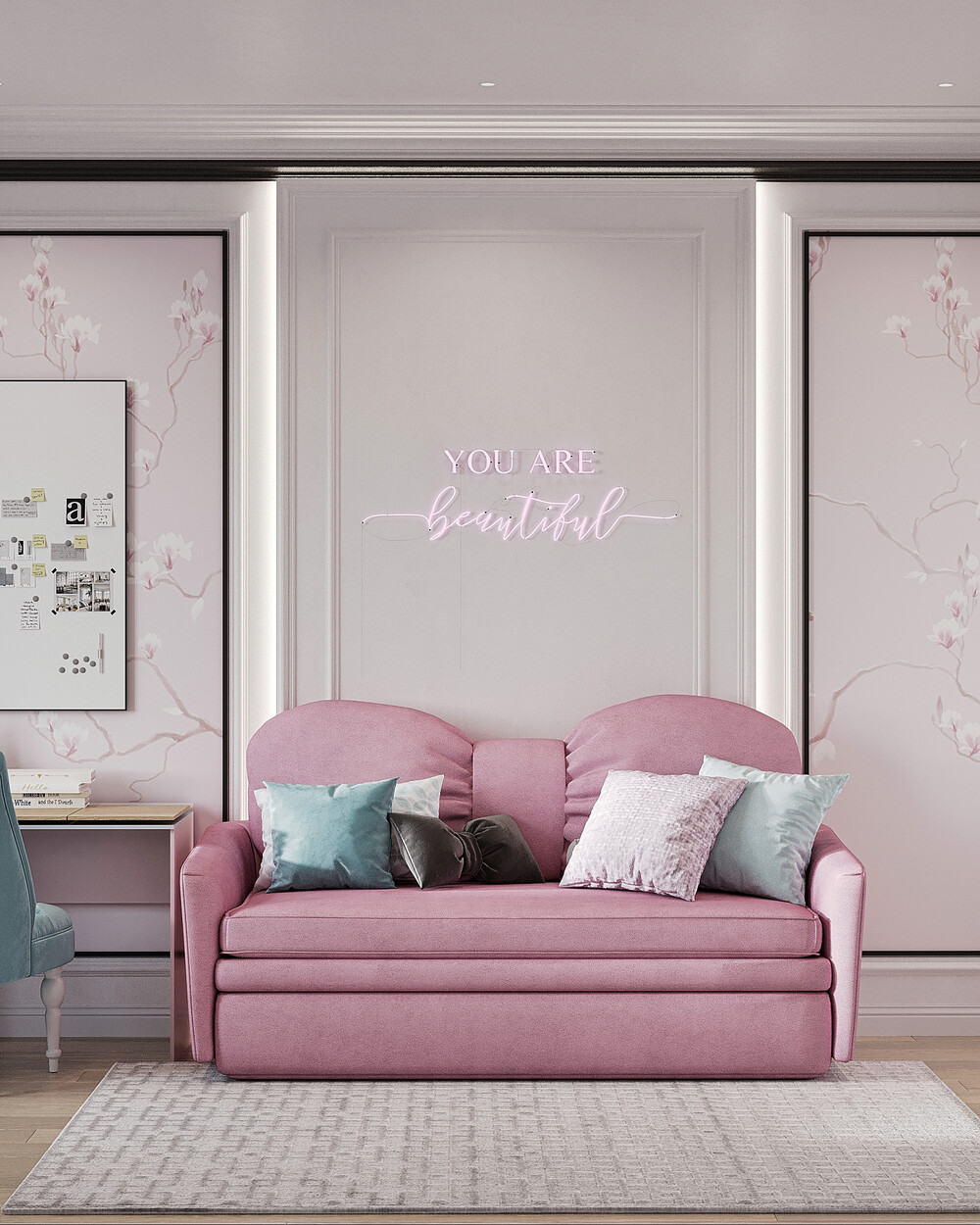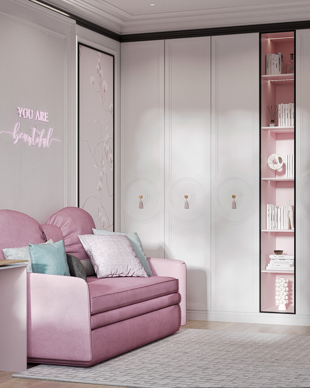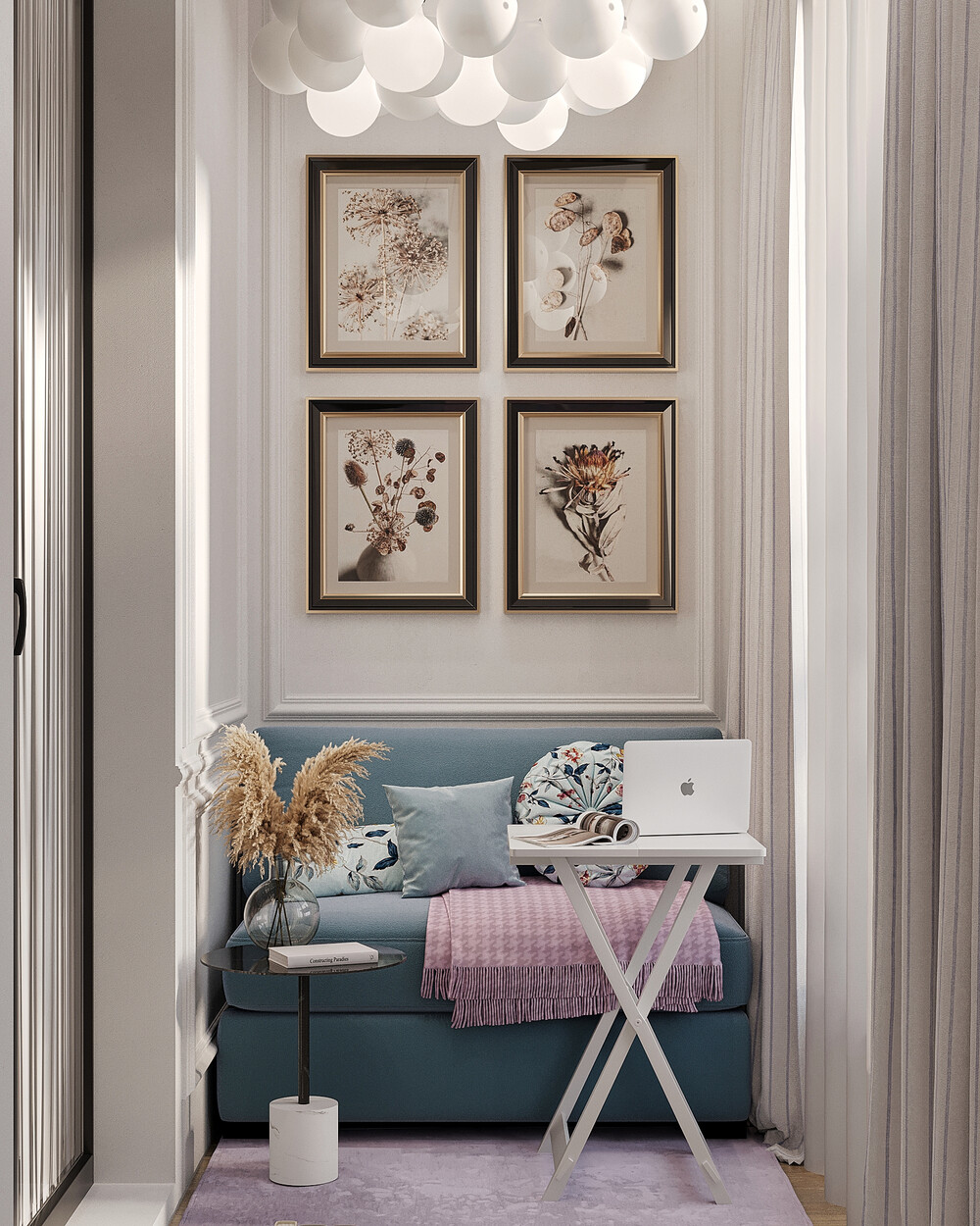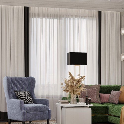 Интерьер выполнен в современном стиле с элементами неоклассики и ар-деко. Цветовая база построена на молочно-белых и теплых серых оттенках, которые делают пространство светлее и визуально просторнее. Синие, зеленые и розовые акценты добавлены через мебель и декор, чтобы сохранить цельность оформления.