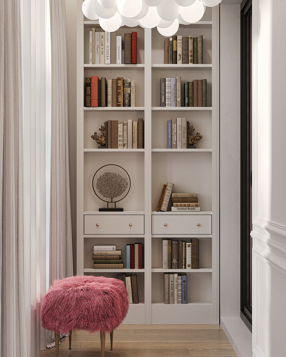 Встроенные шкафы и стеклянные витрины интегрированы в архитектуру стен, поэтому мебель не кажется громоздкой. Для вечернего отдыха предусмотрели кресло и декоративный свет, который помогает переключиться и расслабиться.