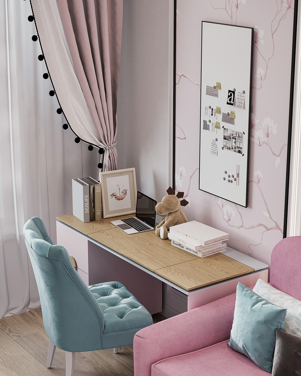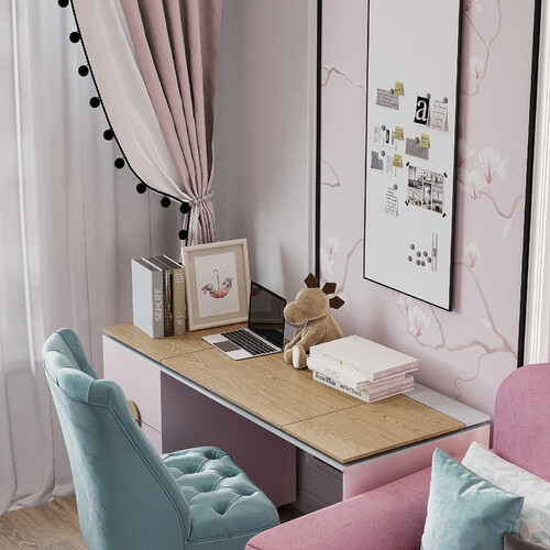 Комнату для девочки оформили в деликатной пудрово-розовой гамме. Пространство разбили на логические сегменты: спальное место с диваном, рабочий стол у окна и шкафы для одежды.