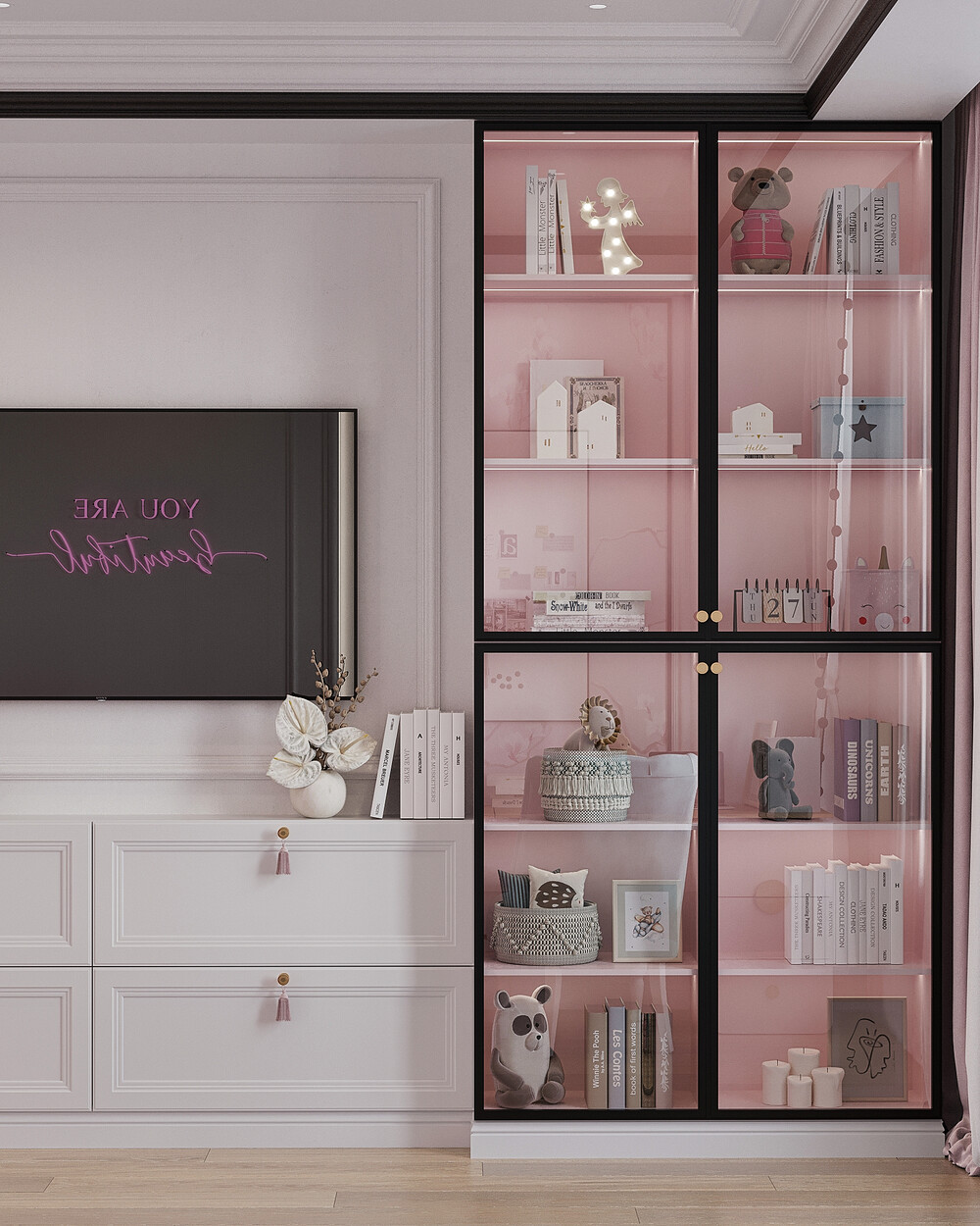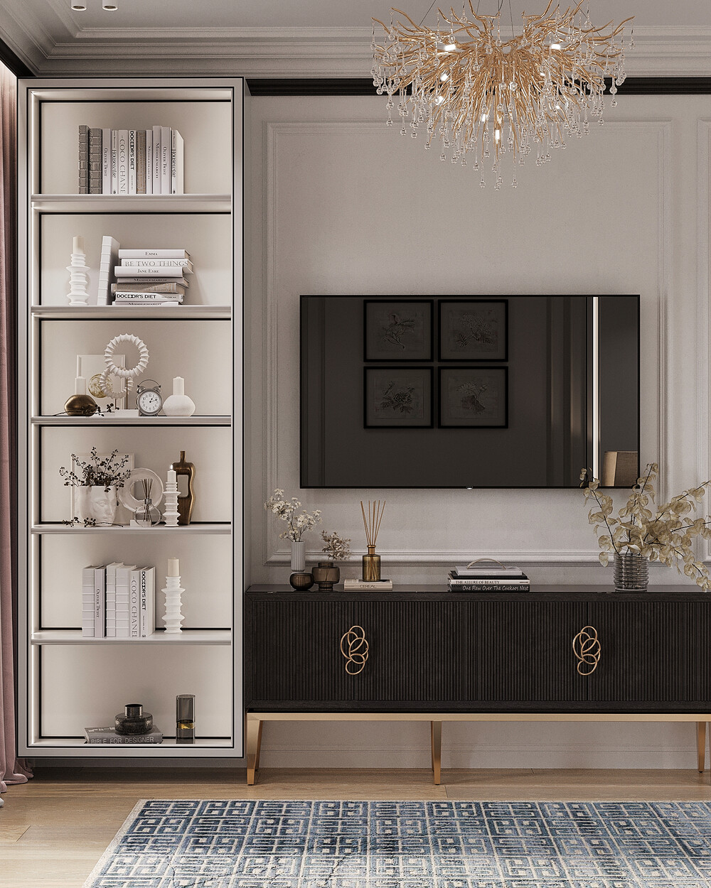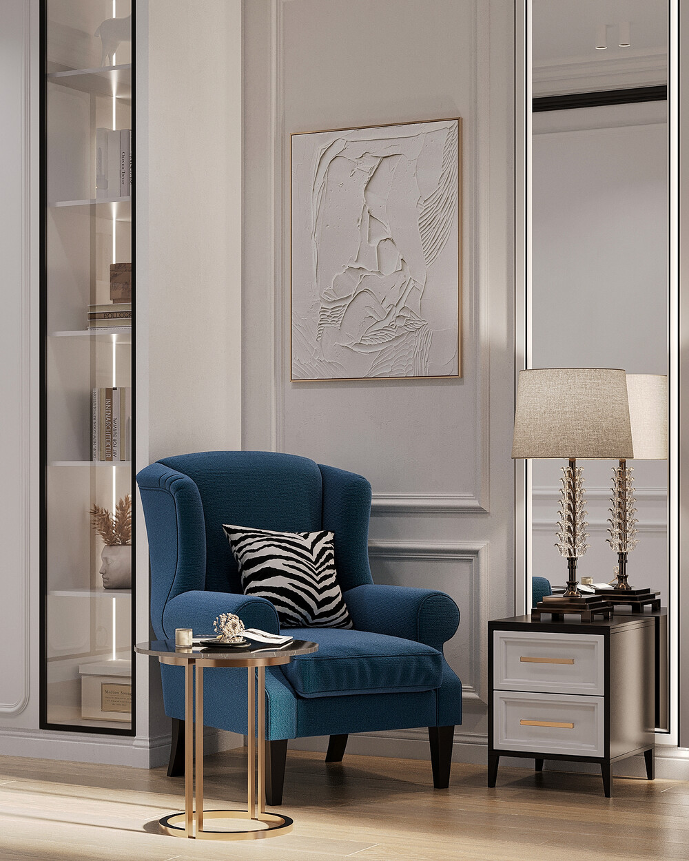 Открытые витрины с интегрированной подсветкой отвели под книги и декор. Графичные элементы и текстиль добавляют интерьеру индивидуальности, сохраняя общий стиль проекта.